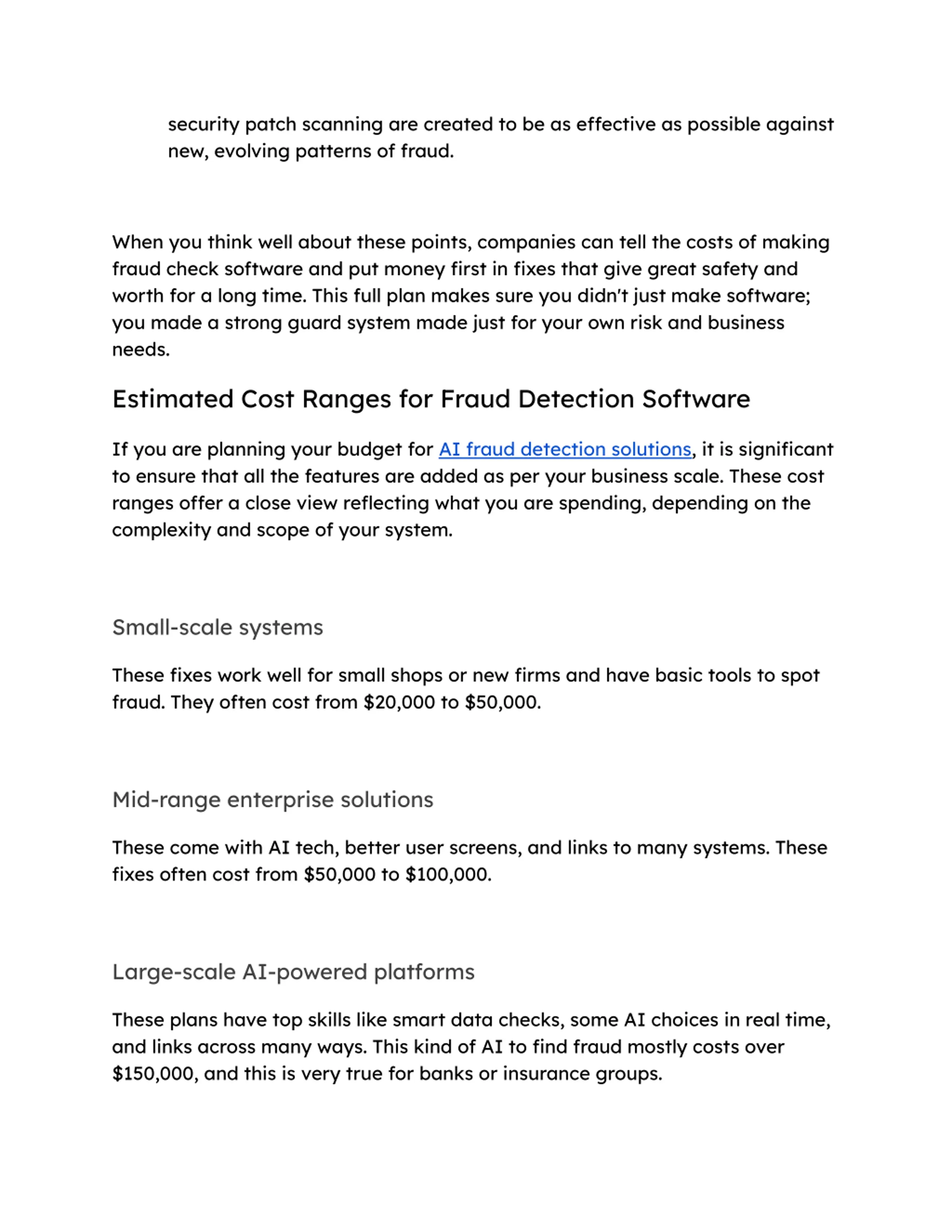 security patch scanning are created to be as effective as possible against new, evolving patterns of fraud. When you think well about these points, companies can tell the costs of making fraud check software and put money first in fixes that give great safety and worth for a long time. This full plan makes sure you didn't just make software; you made a strong guard system made just for your own risk and business needs. Estimated Cost Ranges for Fraud Detection Software If you are planning your budget for AI fraud detection solutions, it is significant to ensure that all the features are added as per your business scale. These cost ranges offer a close view reflecting what you are spending, depending on the complexity and scope of your system. Small-scale systems These fixes work well for small shops or new firms and have basic tools to spot fraud. They often cost from $20,000 to $50,000. Mid-range enterprise solutions These come with AI tech, better user screens, and links to many systems. These fixes often cost from $50,000 to $100,000. Large-scale AI-powered platforms These plans have top skills like smart data checks, some AI choices in real time, and links across many ways. This kind of AI to find fraud mostly costs over $150,000, and this is very true for banks or insurance groups.