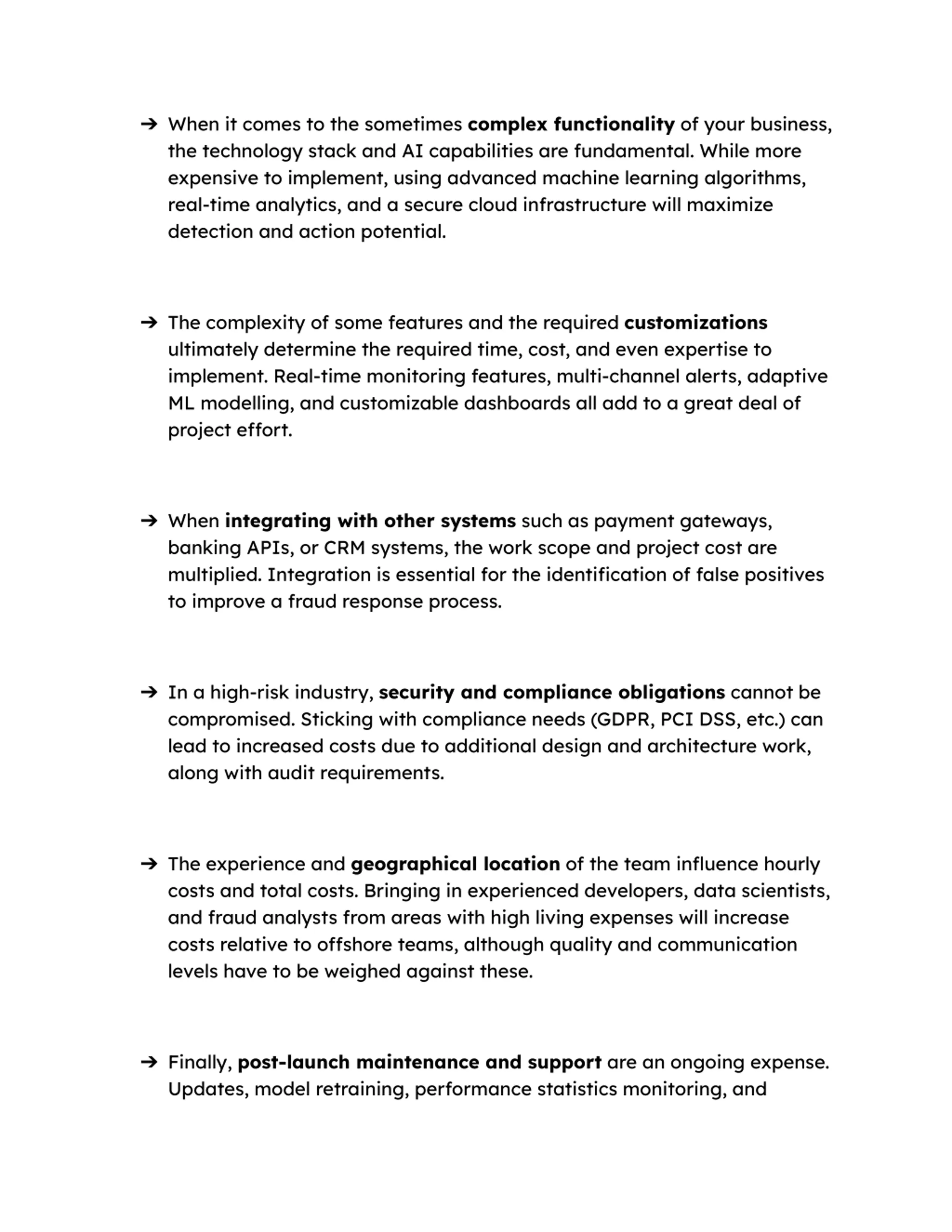 When it comes to the sometimes complex functionality of your business, the technology stack and AI capabilities are fundamental. While more expensive to implement, using advanced machine learning algorithms, real-time analytics, and a secure cloud infrastructure will maximize detection and action potential. The complexity of some features and the required customizations ultimately determine the required time, cost, and even expertise to implement. Real-time monitoring features, multi-channel alerts, adaptive ML modelling, and customizable dashboards all add to a great deal of project effort. When integrating with other systems such as payment gateways, banking APIs, or CRM systems, the work scope and project cost are multiplied. Integration is essential for the identification of false positives to improve a fraud response process. In a high-risk industry, security and compliance obligations cannot be compromised. Sticking with compliance needs (GDPR, PCI DSS, etc.) can lead to increased costs due to additional design and architecture work, along with audit requirements. The experience and geographical location of the team influence hourly costs and total costs. Bringing in experienced developers, data scientists, and fraud analysts from areas with high living expenses will increase costs relative to offshore teams, although quality and communication levels have to be weighed against these. Finally, post-launch maintenance and support are an ongoing expense. Updates, model retraining, performance statistics monitoring, and