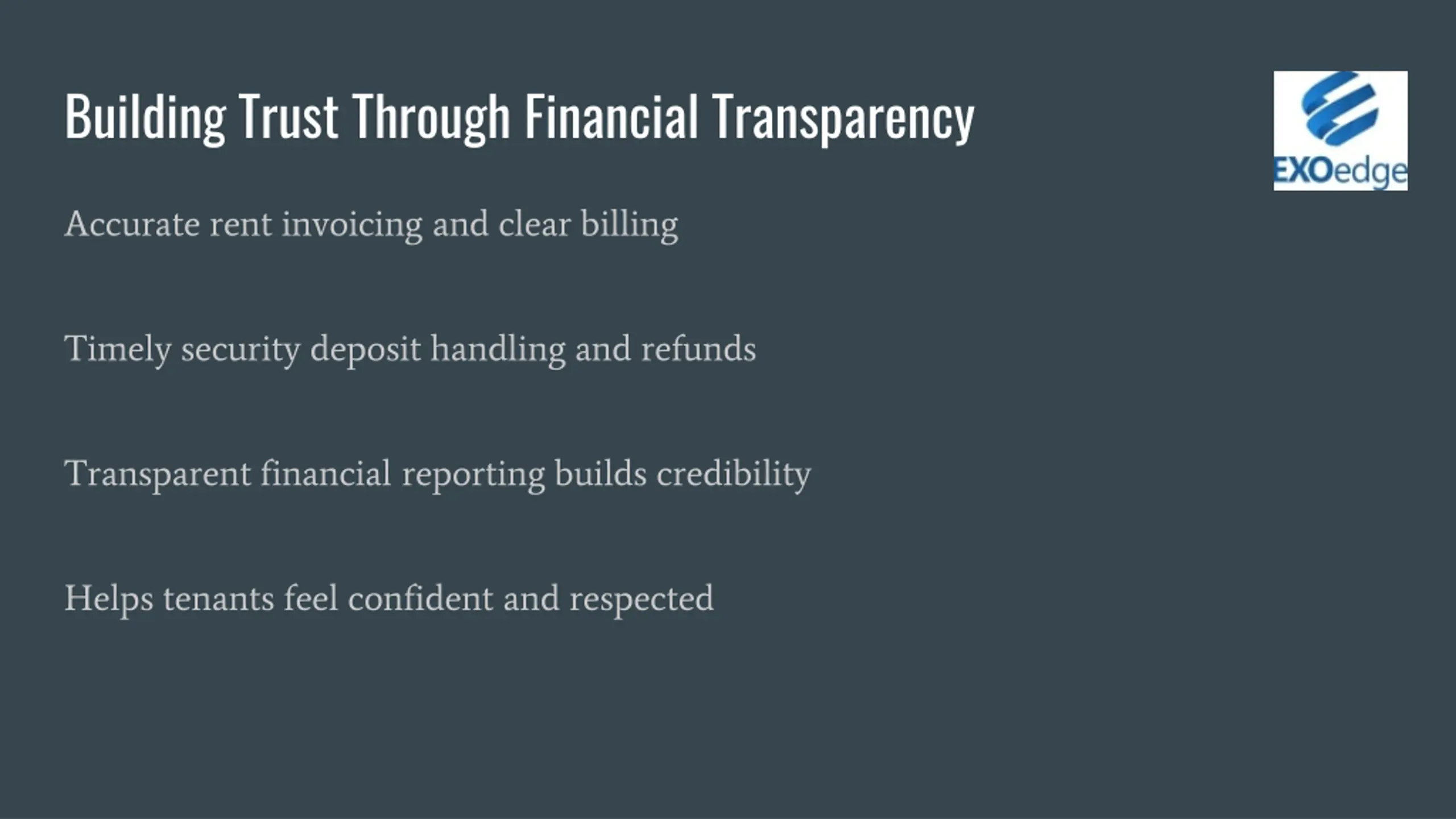 Building Trust Through Financial Transparency Accurate rent invoicing and clear billing Timely security deposit handling and refunds Transparent financial reporting builds credibility Helps tenants feel confident and respected