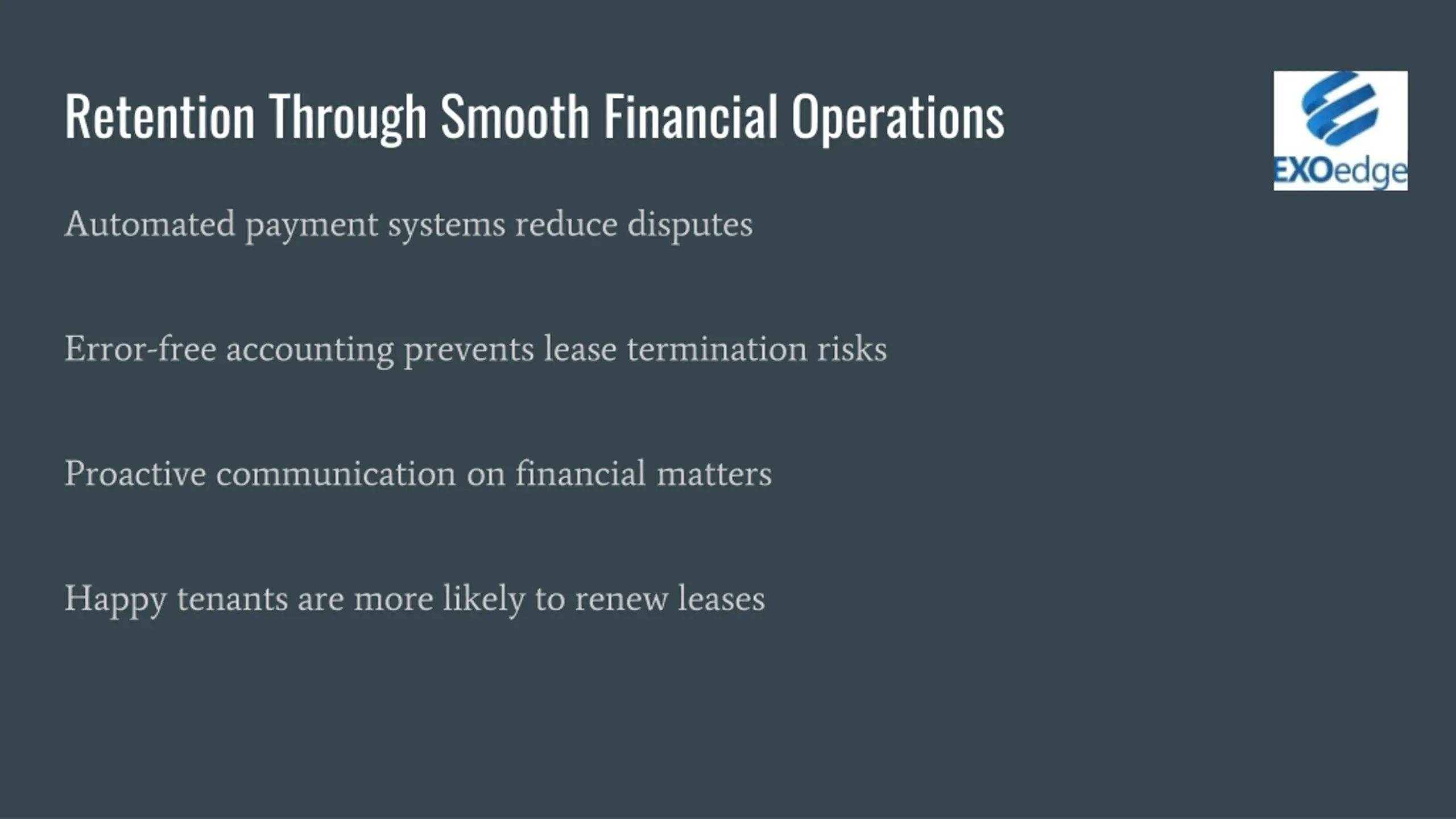Retention Through Smooth Financial Operations Automated payment systems reduce disputes Error-free accounting prevents lease termination risks Proactive communication on financial matters Happy tenants are more likely to renew leases