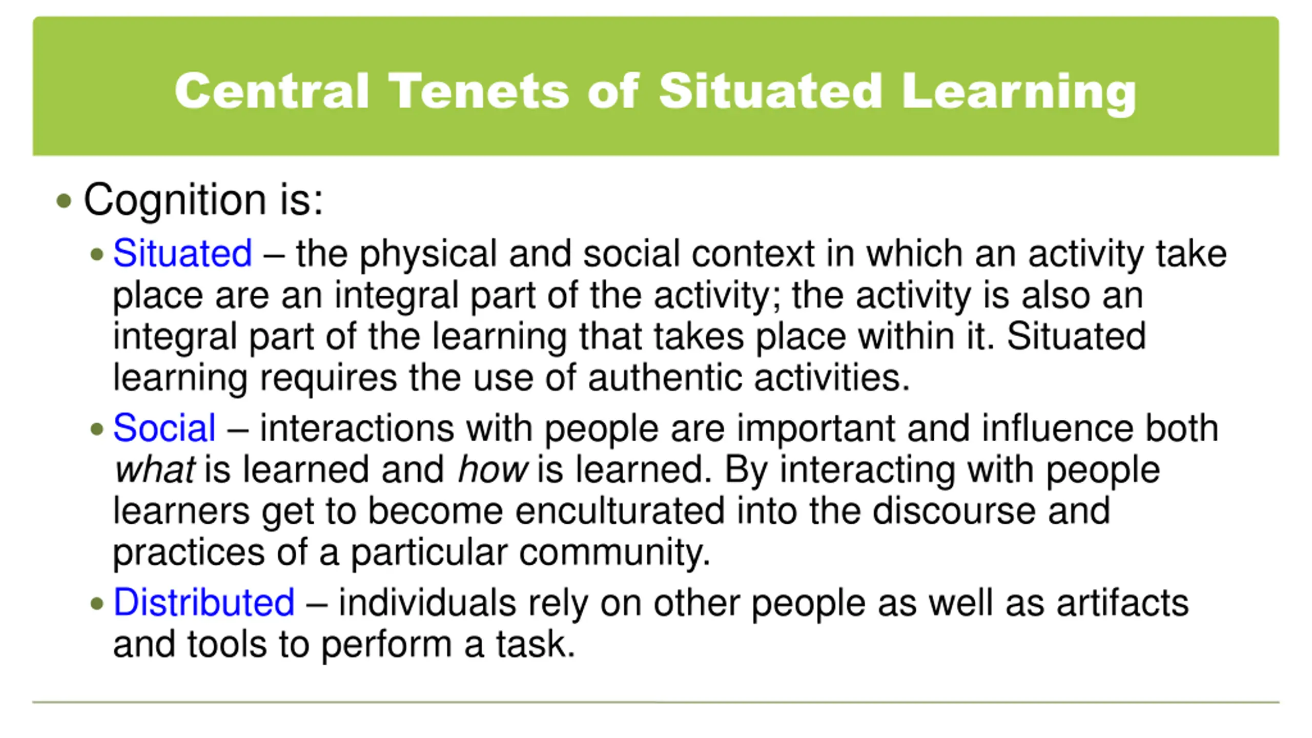 Central Tenets of Situated Learning Cognition is: Situated the physical and social context in which an activity take place are an integral part of the activity; the activity is also an integral part of the learning that takes place within it. Situated learning requires the use of authentic activities. Social interactions with people are important and influence both what is learned and how is learned. By interacting with people learners get to become enculturated into the discourse and practices of a particular community. Distributed individuals rely on other people as well as artifacts and tools to perform a task.
