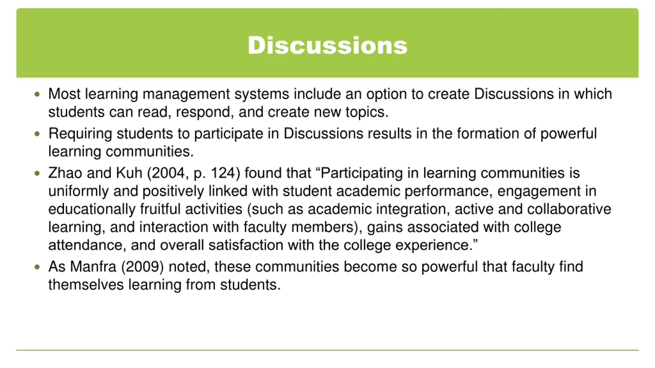Discussions Most learning management systems include an option to create Discussions in which students can read, respond, and create new topics. Requiring students to participate in Discussions results in the formation of powerful learning communities. Zhao and Kuh (2004, p. 124) found that Participating in learning communities is uniformly and positively linked with student academic performance, engagement in educationally fruitful activities (such as academic integration, active and collaborative learning, and interaction with faculty members), gains associated with college attendance, and overall satisfaction with the college experience. As Manfra (2009) noted, these communities become so powerful that faculty find themselves learning from students.
