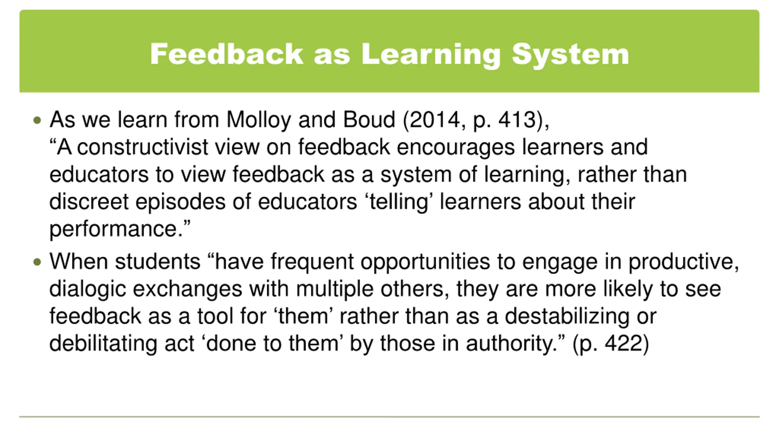 Feedback as Learning System As we learn from Molloy and Boud (2014, p. 413), A constructivist view on feedback encourages learners and educators to view feedback as a system of learning, rather than discreet episodes of educators telling learners about their performance. When students have frequent opportunities to engage in productive, dialogic exchanges with multiple others, they are more likely to see feedback as a tool for them rather than as a destabilizing or debilitating act done to them by those in authority. (p. 422)