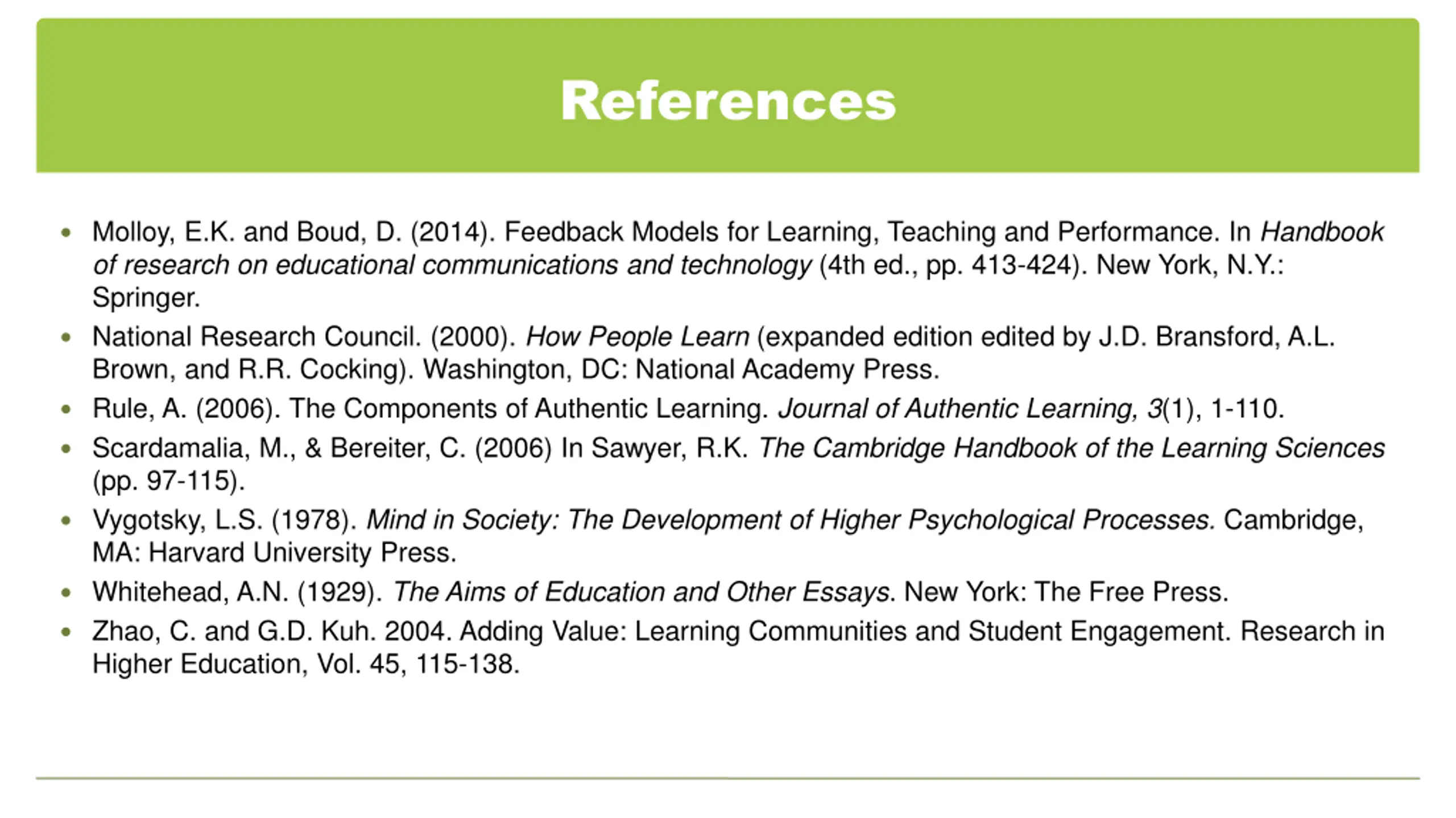 References Molloy, E.K. and Boud, D. (2014). Feedback Models for Learning, Teaching and Performance. In Handbook of research on educational communications and technology (4th ed., pp. 413-424). New York, N.Y.: Springer. National Research Council. (2000). How People Learn (expanded edition edited by J.D. Bransford, A.L. Brown, and R.R. Cocking). Washington, DC: National Academy Press. Rule, A. (2006). The Components of Authentic Learning. Journal of Authentic Learning,3(1), 1-110. Scardamalia, M., & Bereiter, C. (2006) In Sawyer, R.K. The Cambridge Handbook of the Learning Sciences (pp. 97-115). Vygotsky, L.S. (1978). Mind in Society: The Development of Higher Psychological Processes. Cambridge, MA: Harvard University Press. Whitehead, A.N. (1929). The Aims of Education and Other Essays. New York: The Free Press. Zhao, C. and G.D. Kuh. 2004. Adding Value: Learning Communities and Student Engagement. Research in Higher Education, Vol. 45, 115-138.