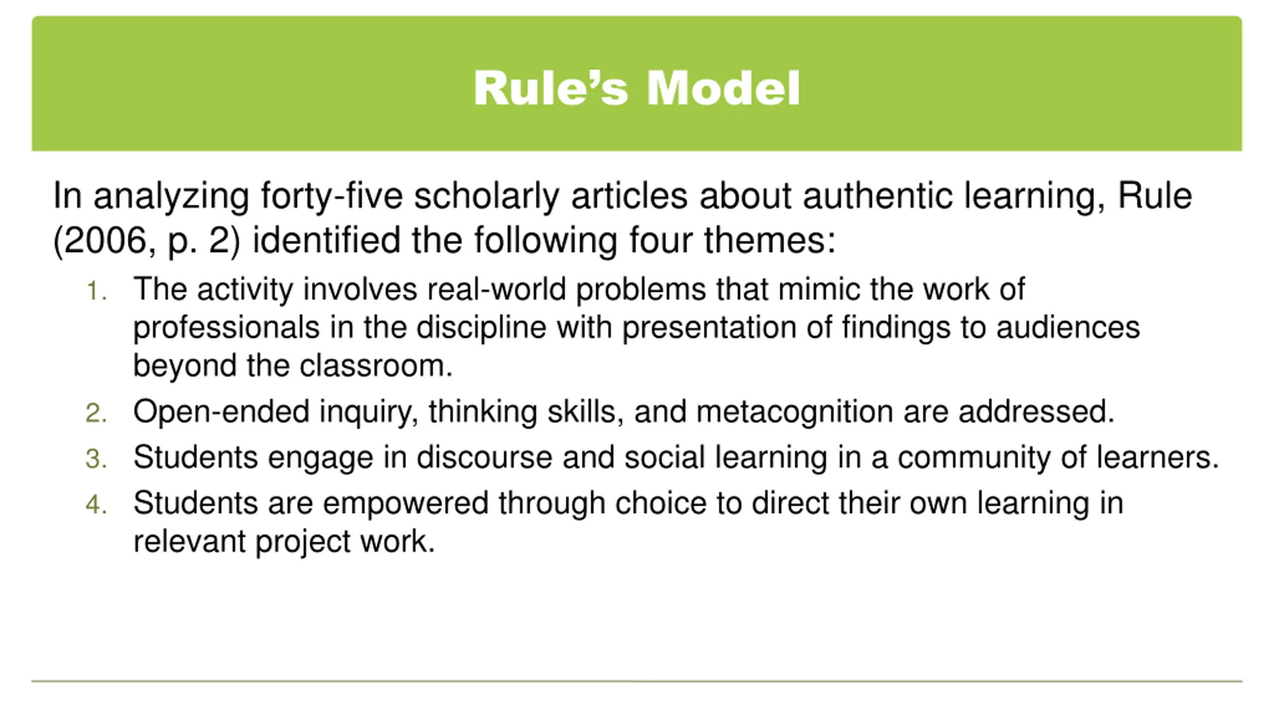 Rules Model In analyzing forty-five scholarly articles about authentic learning, Rule (2006, p. 2) identified the following four themes: 1. The activity involves real-world problems that mimic the work of professionals in the discipline with presentation of findings to audiences beyond the classroom. 2. Open-ended inquiry, thinking skills, and metacognition are addressed. 3. Students engage in discourse and social learning in a community of learners. 4. Students are empowered through choice to direct their own learning in relevant project work.