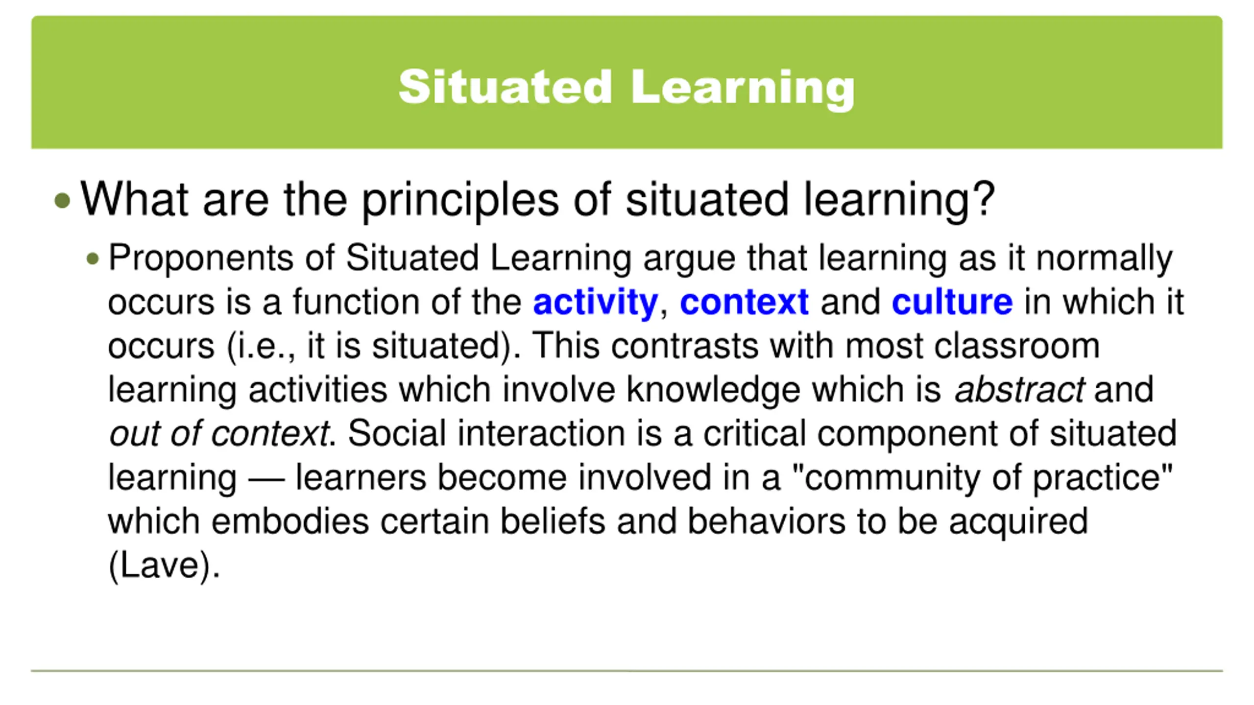 Situated Learning What are the principles of situated learning? Proponents of Situated Learning argue that learning as it normally occurs is a function of the activity, context and culture in which it occurs (i.e., it is situated). This contrasts with most classroom learning activities which involve knowledge which is abstract and out of context. Social interaction is a critical component of situated learning learners become involved in a "community of practice" which embodies certain beliefs and behaviors to be acquired (Lave).