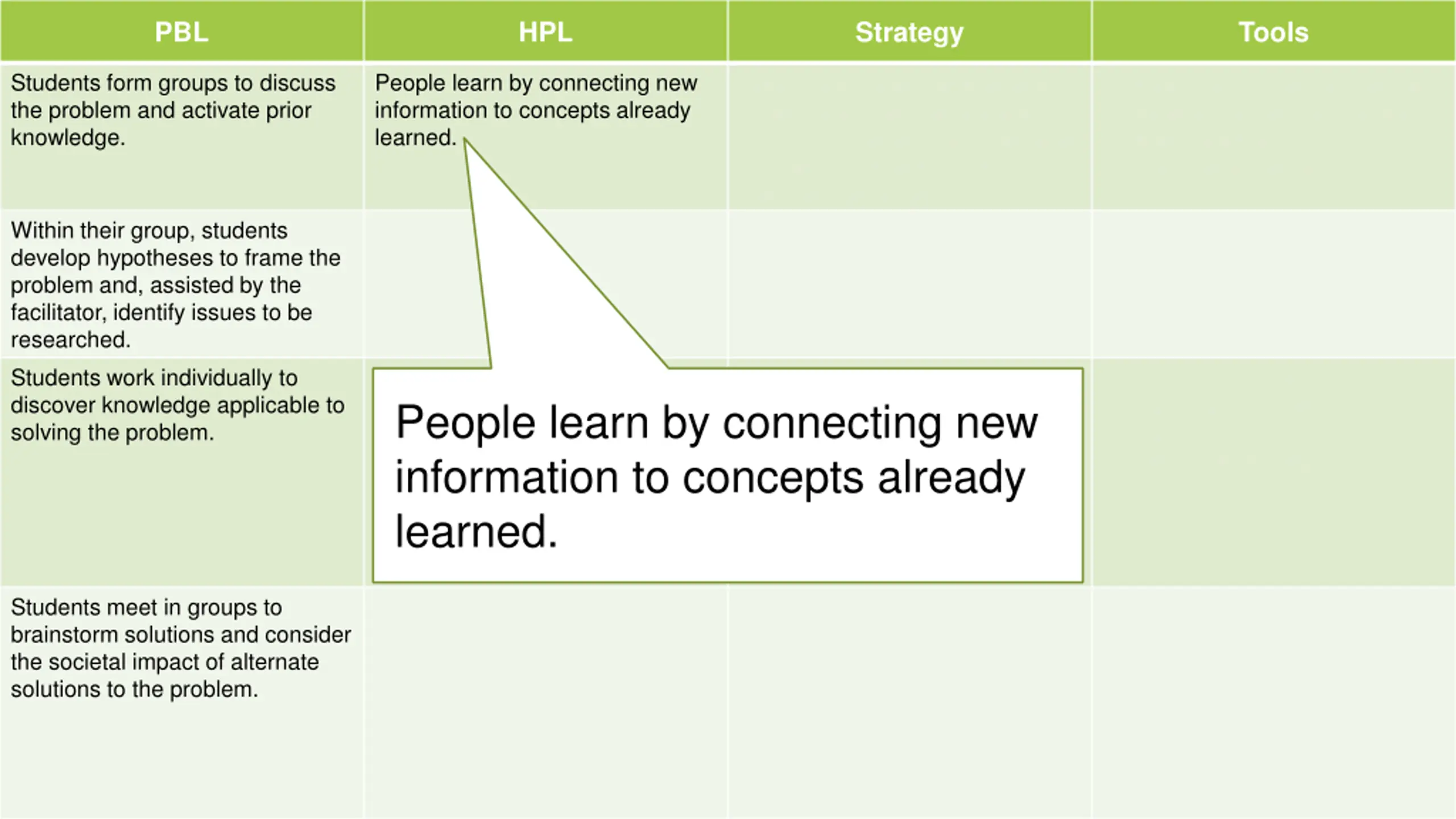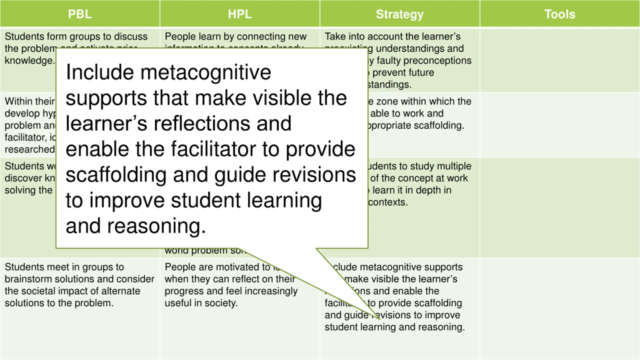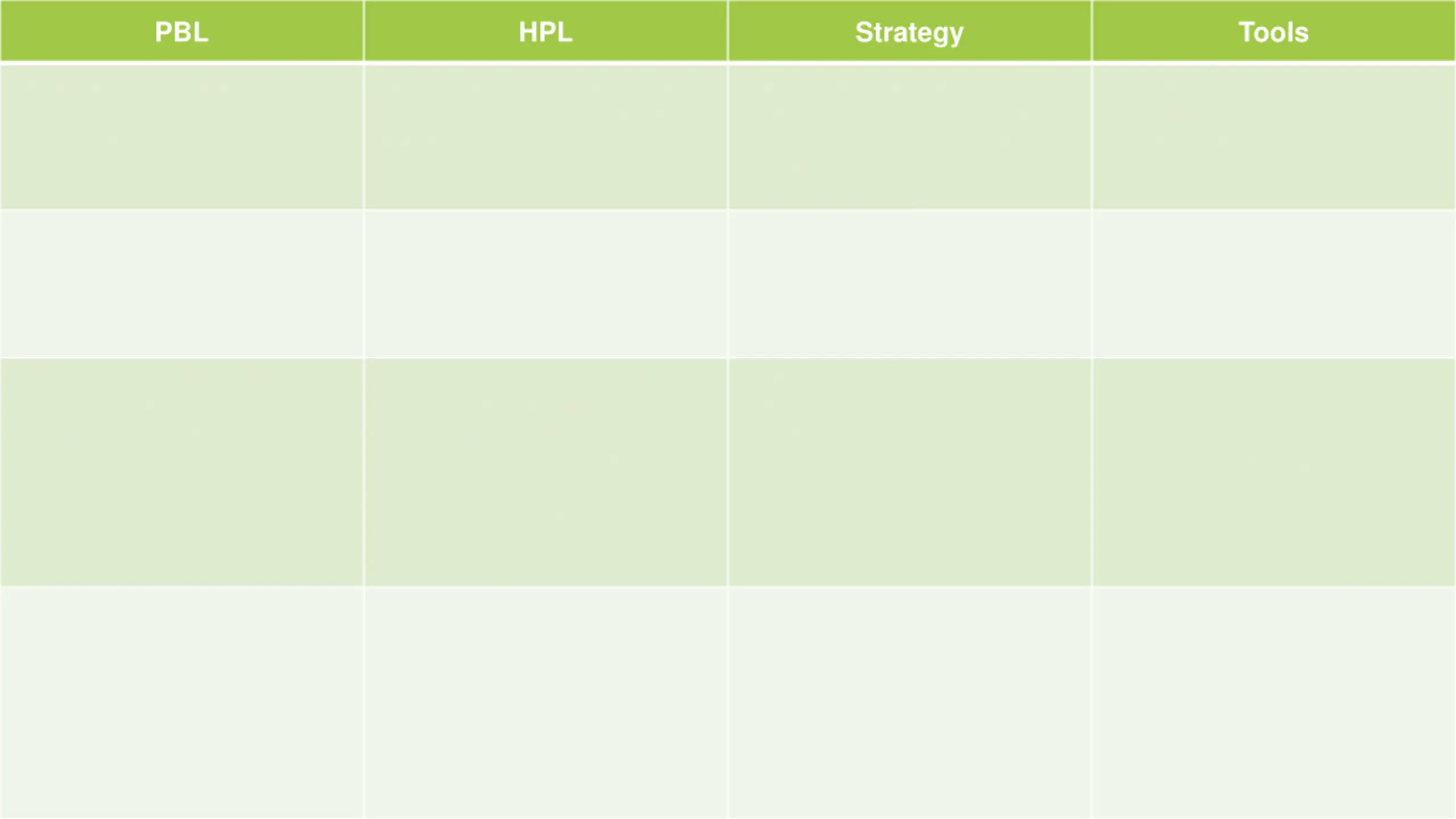 Can PBL Do HPL? To what extent do Problem-Based Learning environments align with the principles of How People Learn? Can the principles of HPL enable PBL designers to create more effective learning environments? How do these principles inform the selection of tools to help PBL students and facilitators leverage these strategies? We constructed a matrix to help think about this and we need your help filling it out.