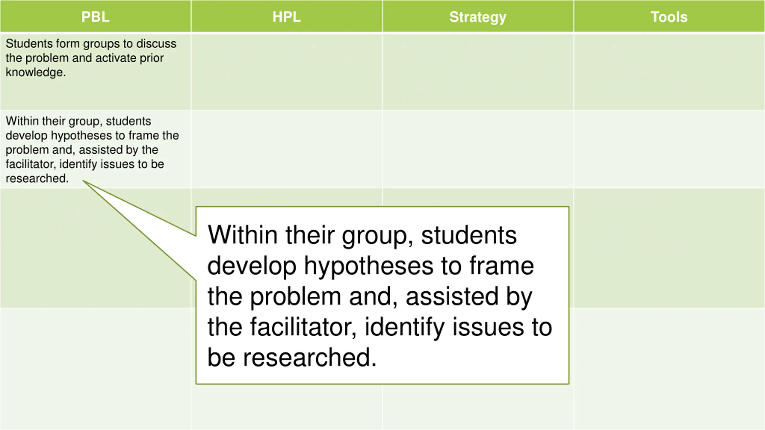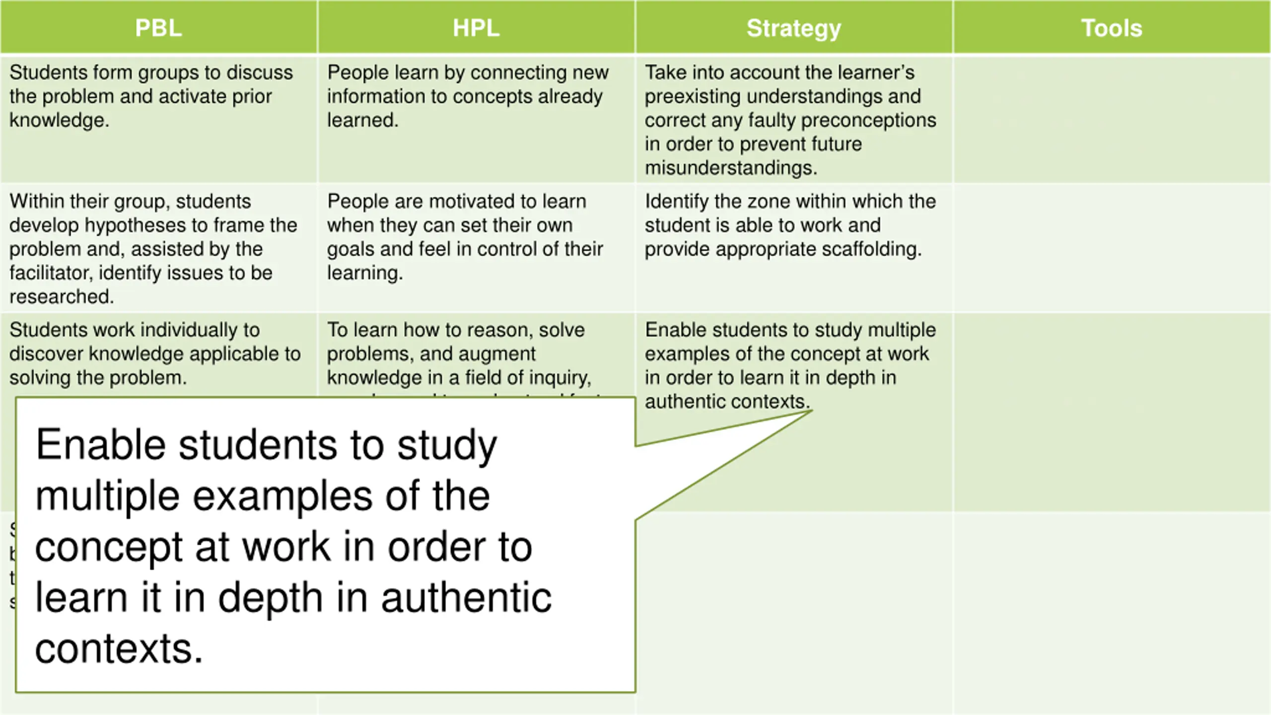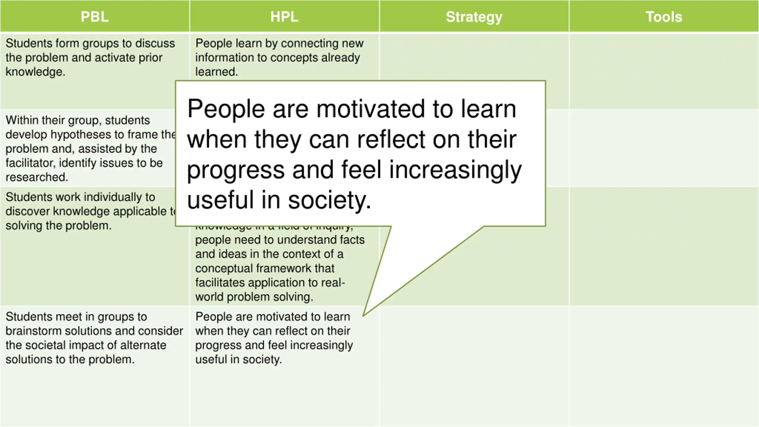 Can PBL Do HPL? To what extent do Problem-Based Learning environments align with the principles of How People Learn? Can the principles of HPL enable PBL designers to create more effective learning environments? How do these principles inform the selection of tools to help PBL students and facilitators leverage these strategies? We constructed a matrix to help think about this and we need your help filling it out.
