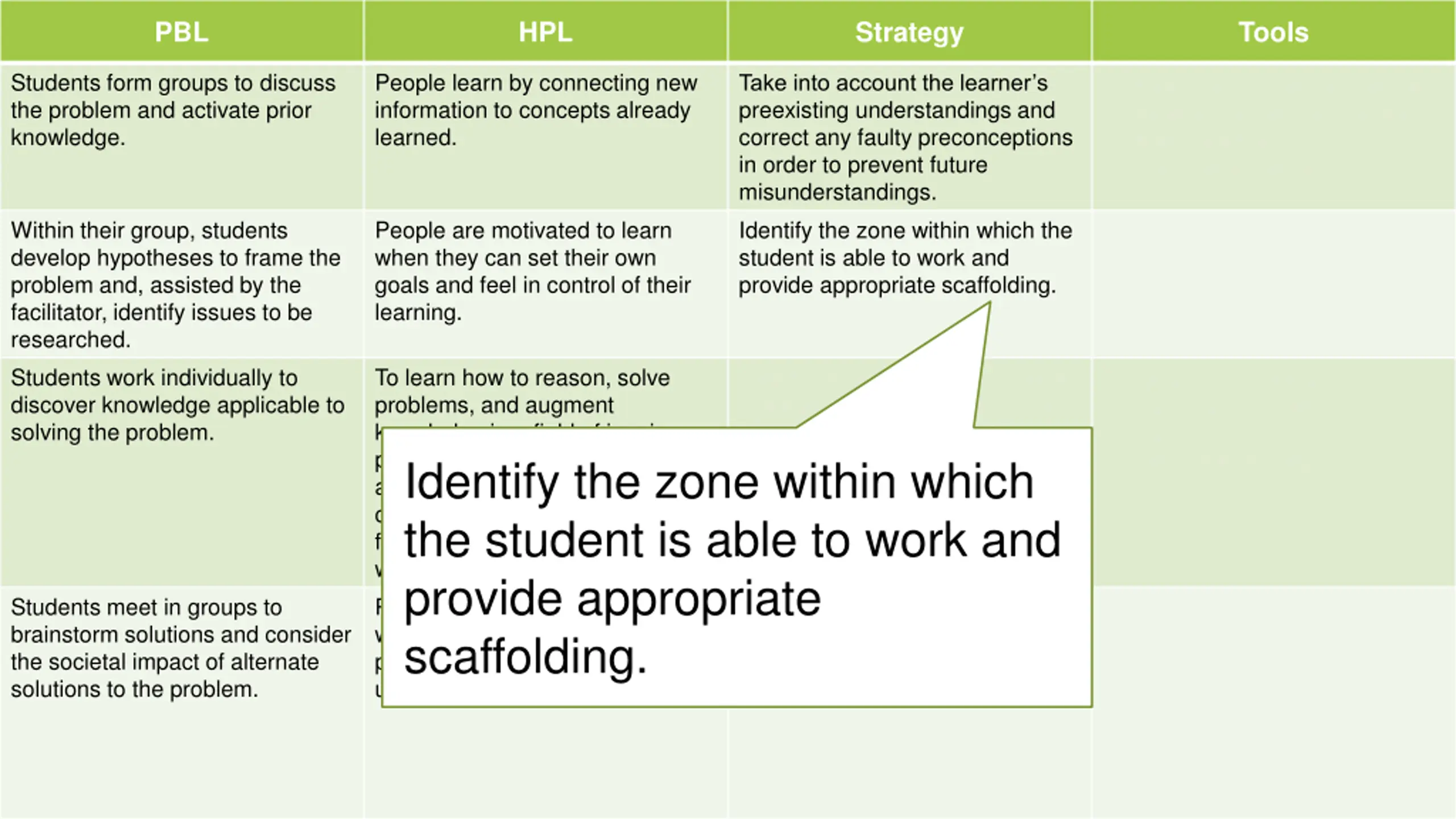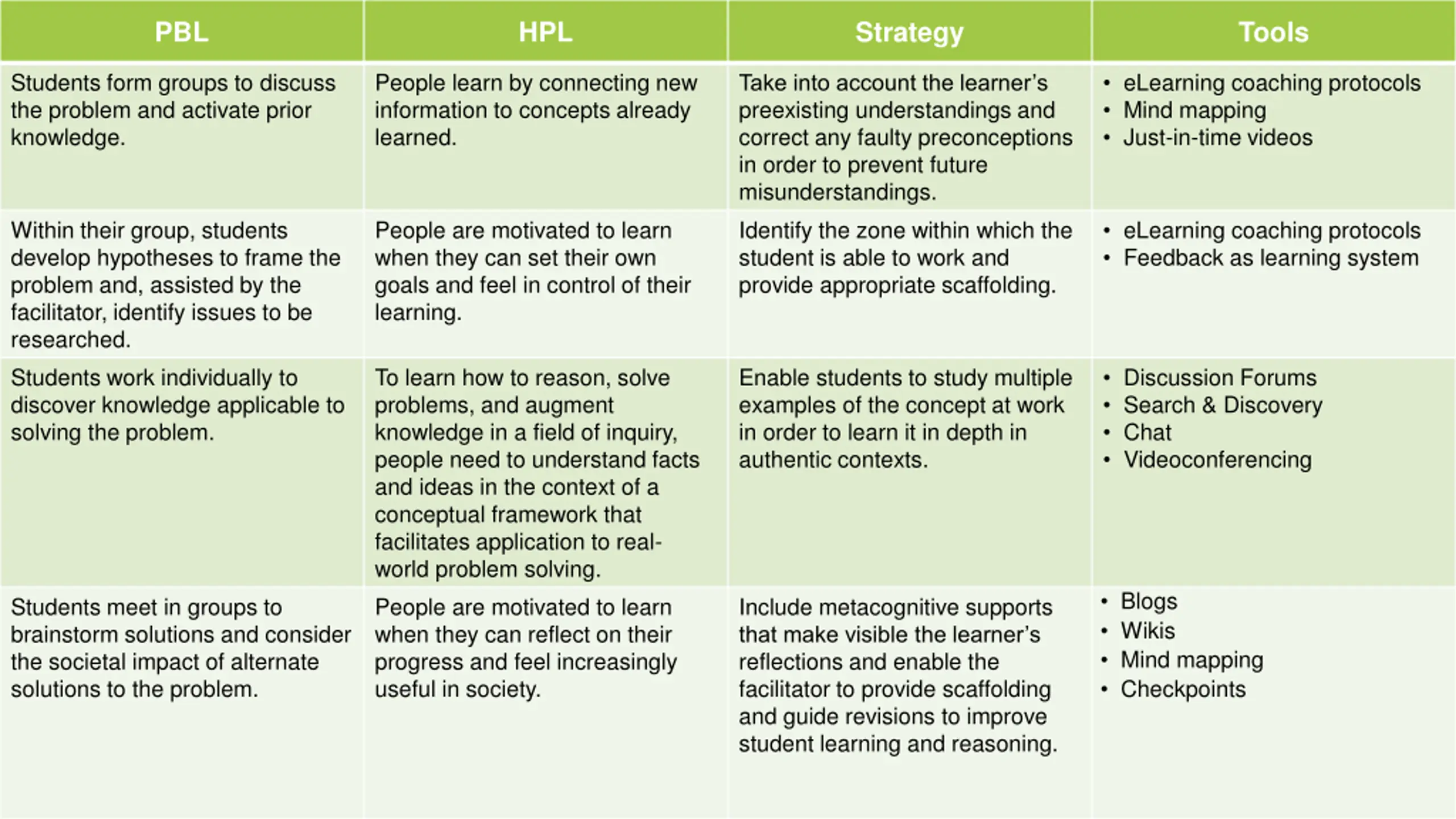 PBL HPL Strategy Tools Students form groups to discuss the problem and activate prior knowledge. People learn by connecting new information to concepts already learned. eLearning coaching protocols Feedback as learning system Mind mapping Just-in-time videos Take into account the learner s preexisting understandings and correct any faulty preconceptions in order to prevent future misunderstandings. Within their group, students develop hypotheses to frame the problem and, assisted by the facilitator, identify issues to be researched. People are motivated to learn when they can set their own goals and feel in control of their learning. Identify the zone within which the student is able to work and provide appropriate scaffolding. eLearning coaching protocols Feedback as learning system Students work individually to discover knowledge applicable to solving the problem. To learn how to reason, solve problems, and augment knowledge in a field of inquiry, people need to understand facts and ideas in the context of a conceptual framework that facilitates application to real- world problem solving. Enable students to study multiple examples of the concept at work in order to learn it in depth in authentic contexts. Discussion Forums Search & Discovery Chat Videoconferencing Students form groups to discuss the problem and activate prior knowledge. Blogs Wikis Mind mapping Checkpoints Students meet in groups to brainstorm solutions and consider the societal impact of alternate solutions to the problem. People are motivated to learn when they can reflect on their progress and feel increasingly useful in society. Include metacognitive supports that make visible the learner s reflections and enable the facilitator to provide scaffolding and guide revisions to improve student learning and reasoning.