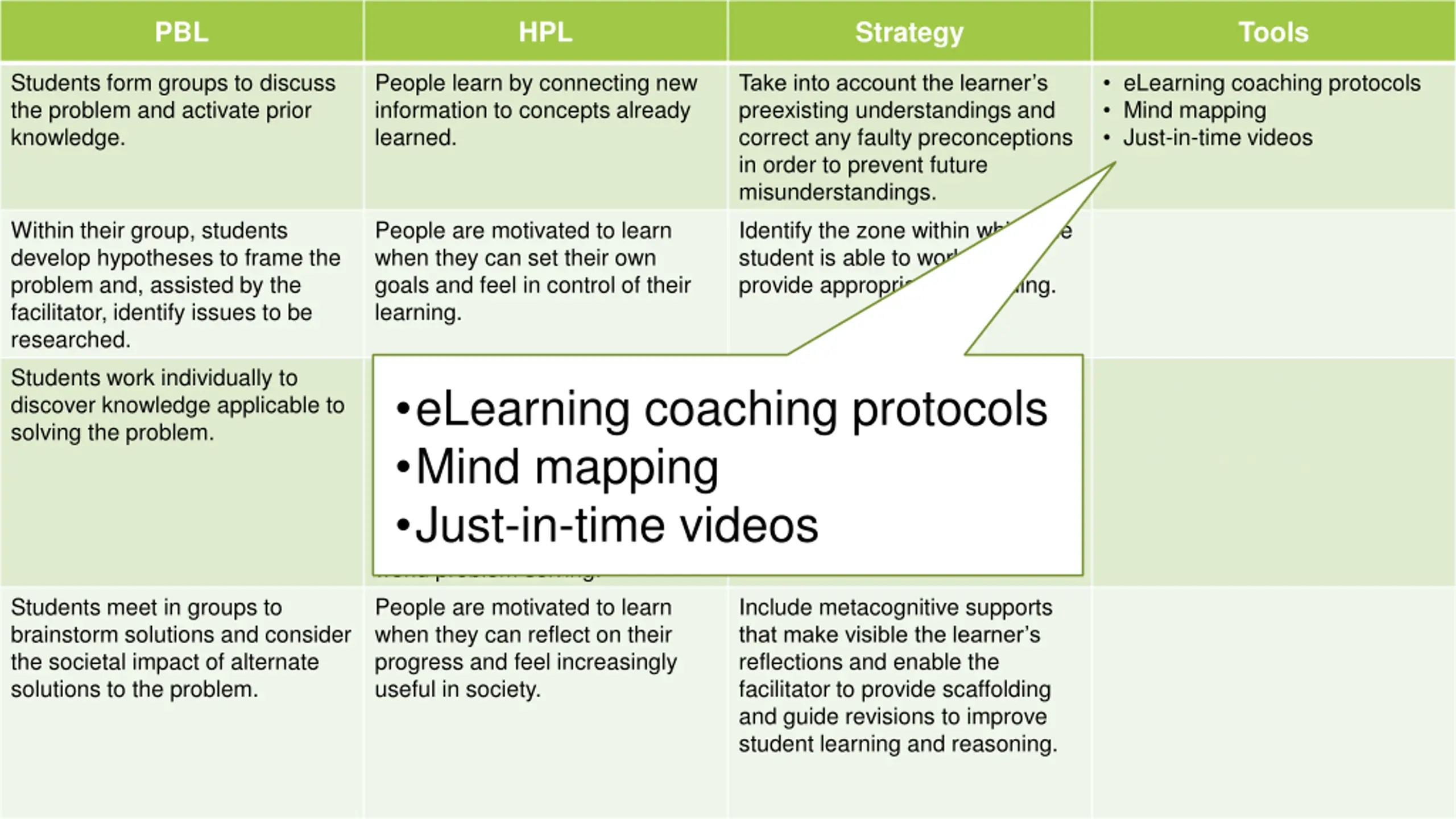 PBL HPL Strategy Tools Students form groups to discuss the problem and activate prior knowledge. People learn by connecting new information to concepts already learned. eLearning coaching protocols Mind mapping Just-in-time videos Take into account the learner s preexisting understandings and correct any faulty preconceptions in order to prevent future misunderstandings. Within their group, students develop hypotheses to frame the problem and, assisted by the facilitator, identify issues to be researched. People are motivated to learn when they can set their own goals and feel in control of their learning. Identify the zone within which the student is able to work and provide appropriate scaffolding. eLearning coaching protocols Feedback as learning system Students work individually to discover knowledge applicable to solving the problem. To learn how to reason, solve problems, and augment knowledge in a field of inquiry, people need to understand facts and ideas in the context of a conceptual framework that facilitates application to real- world problem solving. Enable students to study multiple examples of the concept at work in order to learn it in depth in authentic contexts. Discussion Forums Search & Discovery Chat Videoconferencing eLearning coaching protocols Mind mapping Just-in-time videos Blogs Wikis Mind mapping Checkpoints Students meet in groups to brainstorm solutions and consider the societal impact of alternate solutions to the problem. People are motivated to learn when they can reflect on their progress and feel increasingly useful in society. Include metacognitive supports that make visible the learner s reflections and enable the facilitator to provide scaffolding and guide revisions to improve student learning and reasoning.