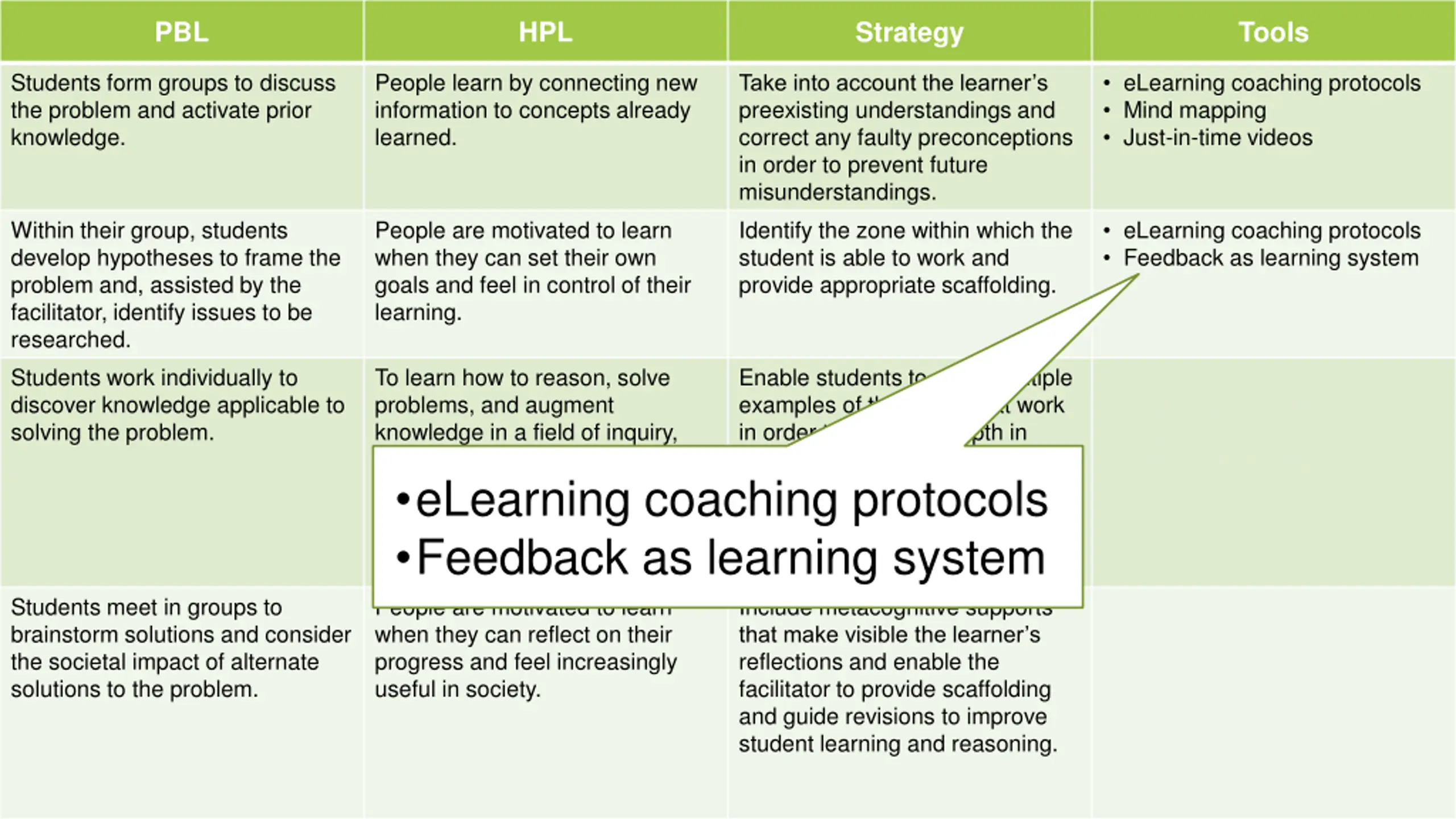 PBL HPL Strategy Tools Students form groups to discuss the problem and activate prior knowledge. People learn by connecting new information to concepts already learned. eLearning coaching protocols Feedback as learning system Mind mapping Just-in-time videos Take into account the learner s preexisting understandings and correct any faulty preconceptions in order to prevent future misunderstandings. To learn how to reason, solve problems, and augment knowledge in a field of inquiry, people need to understand facts and ideas in the context of a conceptual framework that facilitates application to real- world problem solving. Within their group, students develop hypotheses to frame the problem and, assisted by the facilitator, identify issues to be researched. People are motivated to learn when they can set their own goals and feel in control of their learning. Identify the zone within which the student is able to work and provide appropriate scaffolding. eLearning coaching protocols Feedback as learning system Students work individually to discover knowledge applicable to solving the problem. To learn how to reason, solve problems, and augment knowledge in a field of inquiry, people need to understand facts and ideas in the context of a conceptual framework that facilitates application to real- world problem solving. Enable students to study multiple examples of the concept at work in order to learn it in depth in authentic contexts. Discussion Forums Search & Discovery Chat Videoconferencing Blogs Wikis Mind mapping Checkpoints Students meet in groups to brainstorm solutions and consider the societal impact of alternate solutions to the problem. People are motivated to learn when they can reflect on their progress and feel increasingly useful in society. Include metacognitive supports that make visible the learner s reflections and enable the facilitator to provide scaffolding and guide revisions to improve student learning and reasoning.