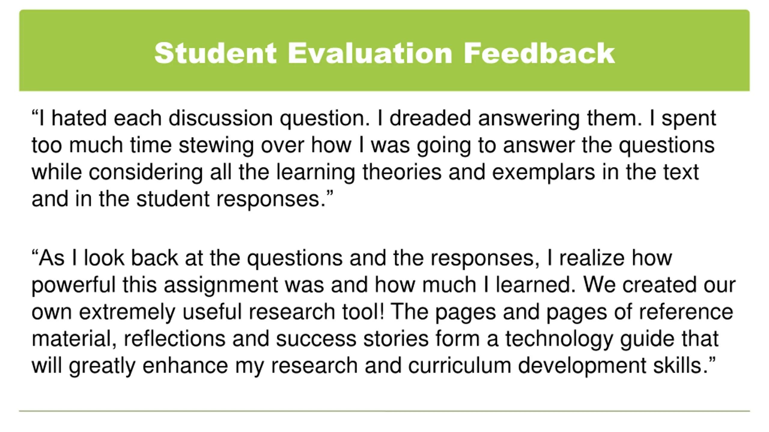 Student Evaluation Feedback I hated each discussion question. I dreaded answering them. I spent too much time stewing over how I was going to answer the questions while considering all the learning theories and exemplars in the text and in the student responses. As I look back at the questions and the responses, I realize how powerful this assignment was and how much I learned. We created our own extremely useful research tool! The pages and pages of reference material, reflections and success stories form a technology guide that will greatly enhance my research and curriculum development skills.