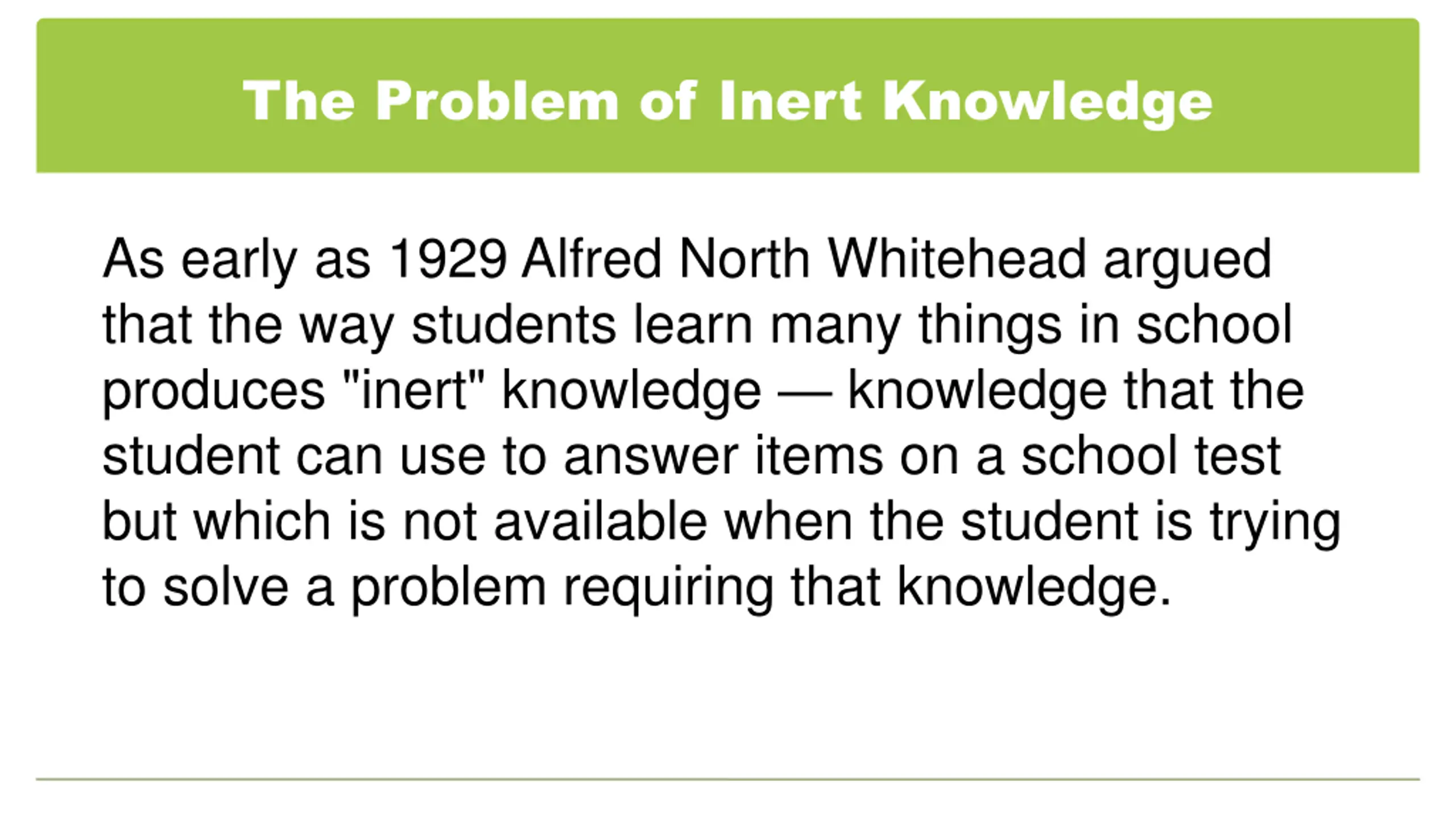 The Problem of Inert Knowledge As early as 1929 Alfred North Whitehead argued that the way students learn many things in school produces "inert" knowledge knowledge that the student can use to answer items on a school test but which is not available when the student is trying to solve a problem requiring that knowledge.