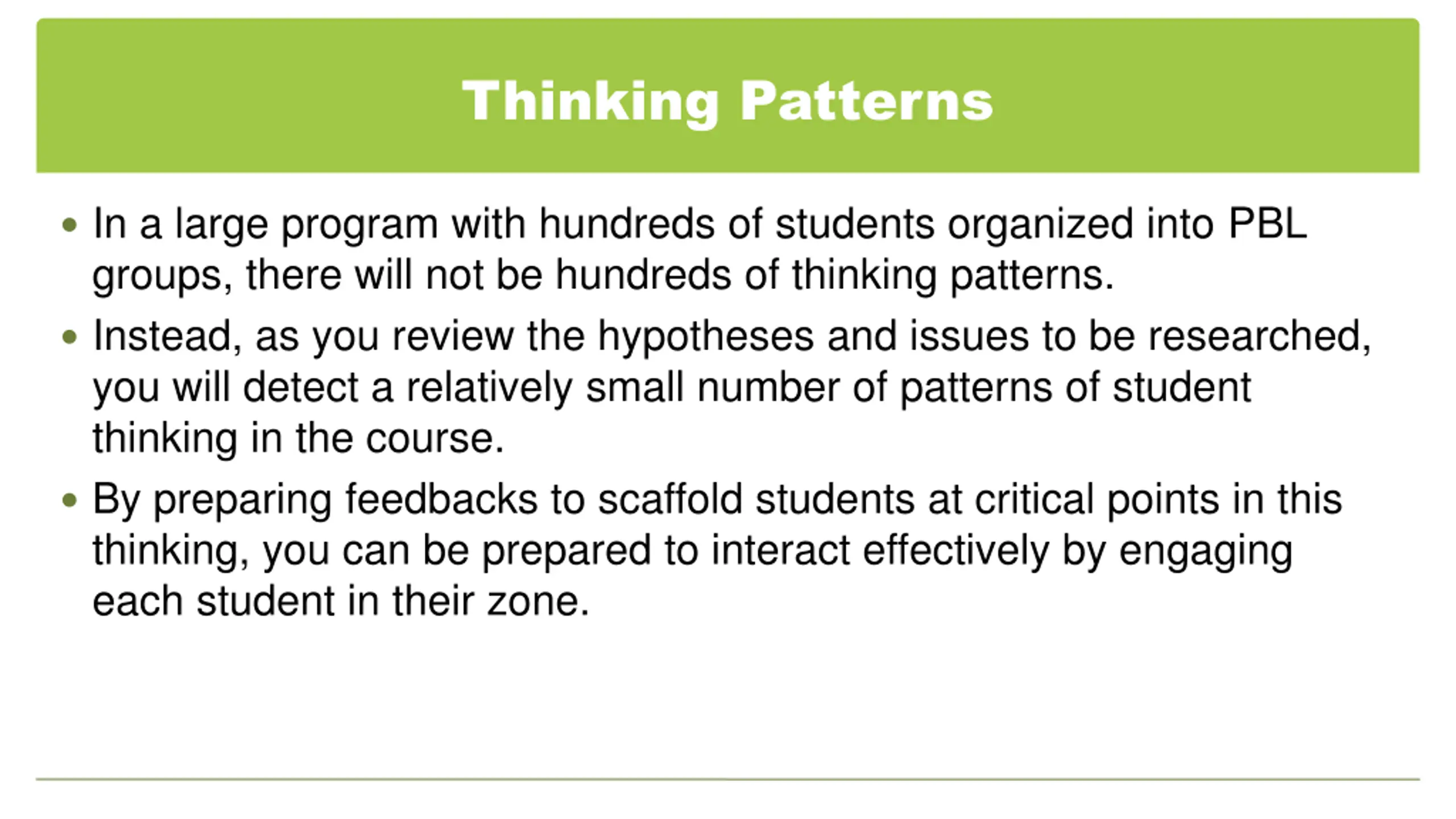 Thinking Patterns In a large program with hundreds of students organized into PBL groups, there will not be hundreds of thinking patterns. Instead, as you review the hypotheses and issues to be researched, you will detect a relatively small number of patterns of student thinking in the course. By preparing feedbacks to scaffold students at critical points in this thinking, you can be prepared to interact effectively by engaging each student in their zone.