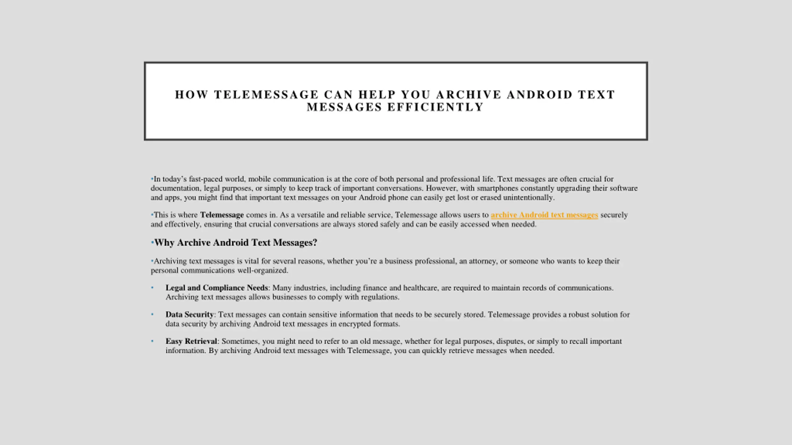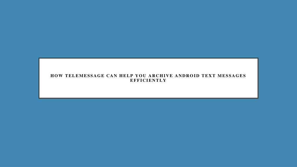 HOW TELEMESSAGE CAN HELP YOU ARCHIVE ANDROID TEXT MESSAGES EFFICIENTLY In today s fast-paced world, mobile communication is at the core of both personal and professional life. Text messages are often crucial for documentation, legal purposes, or simply to keep track of important conversations. However, with smartphones constantly upgrading their software and apps, you might find that important text messages on your Android phone can easily get lost or erased unintentionally. This is where Telemessage comes in. As a versatile and reliable service, Telemessage allows users to archive Android text messages securely and effectively, ensuring that crucial conversations are always stored safely and can be easily accessed when needed. Why Archive Android Text Messages? Archiving text messages is vital for several reasons, whether you re a business professional, an attorney, or someone who wants to keep their personal communications well-organized. Legal and Compliance Needs: Many industries, including finance and healthcare, are required to maintain records of communications. Archiving text messages allows businesses to comply with regulations. Data Security: Text messages can contain sensitive information that needs to be securely stored. Telemessage provides a robust solution for data security by archiving Android text messages in encrypted formats. Easy Retrieval: Sometimes, you might need to refer to an old message, whether for legal purposes, disputes, or simply to recall important information. By archiving Android text messages with Telemessage, you can quickly retrieve messages when needed.