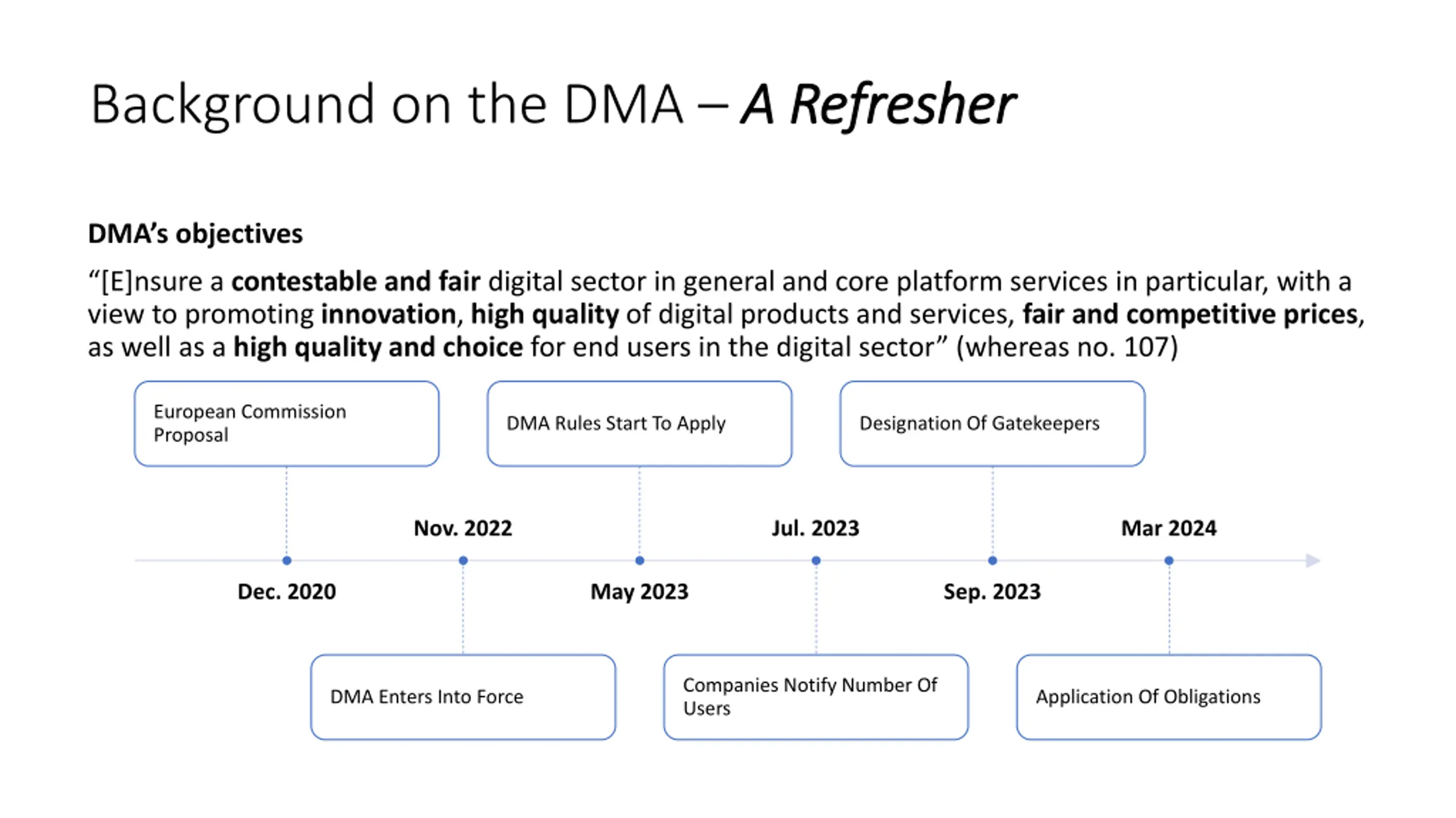 Background on the DMA A Refresher A Refresher DMA s objectives [E]nsure a contestable and fair digital sector in general and core platform services in particular, with a view to promoting innovation, high quality of digital products and services, fair and competitive prices, as well as a high quality and choice for end users in the digital sector (whereas no. 107) European Commission Proposal DMA Rules Start To Apply Designation Of Gatekeepers Nov. 2022 Jul. 2023 Mar 2024 Dec. 2020 May 2023 Sep. 2023 Companies Notify Number Of Users DMA Enters Into Force Application Of Obligations