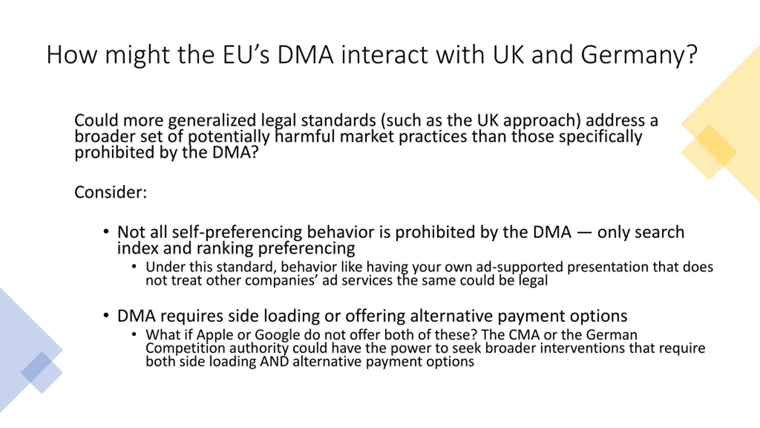 How might the EUs DMA interact with UK and Germany? Could more generalized legal standards (such as the UK approach) address a broader set of potentially harmful market practices than those specifically prohibited by the DMA? Consider: Not all self-preferencing behavior is prohibited by the DMA only search index and ranking preferencing Under this standard, behavior like having your own ad-supported presentation that does not treat other companies ad services the same could be legal DMA requires side loading or offering alternative payment options What if Apple or Google do not offer both of these? The CMA or the German Competition authority could have the power to seek broader interventions that require both side loading AND alternative payment options