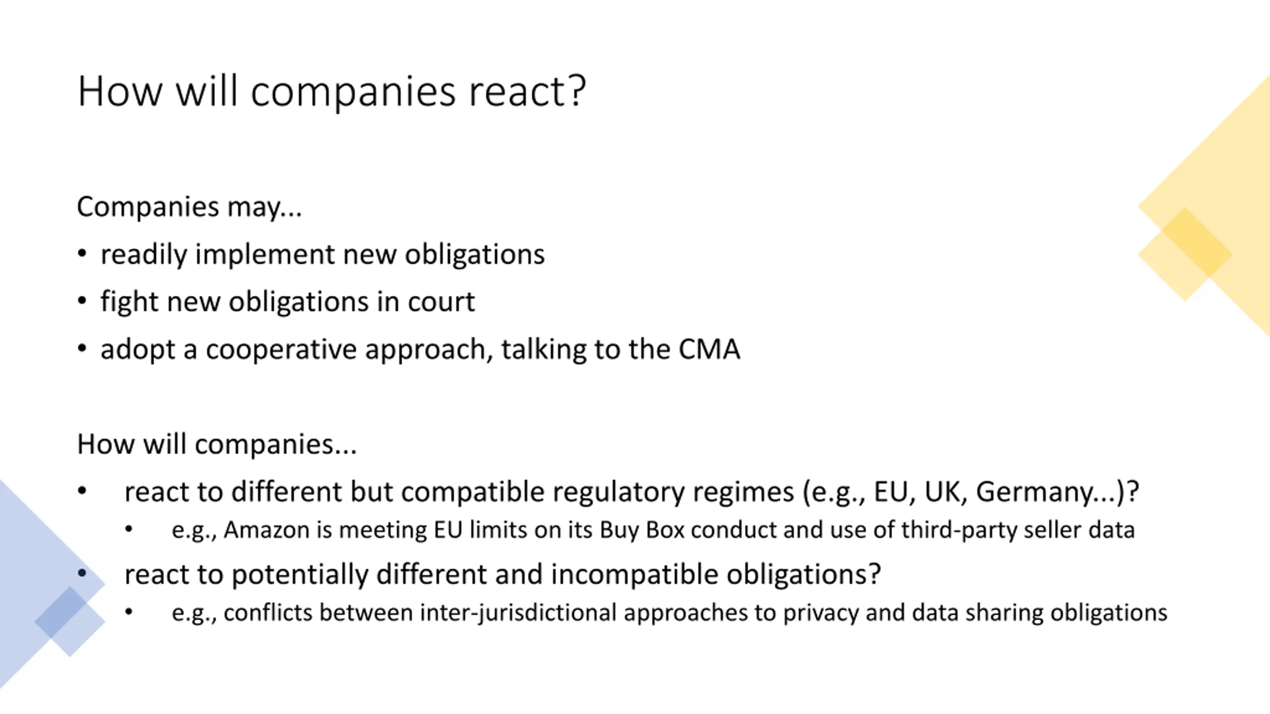 How will companies react? Companies may... readily implement new obligations fight new obligations in court adopt a cooperative approach, talking to the CMA How will companies... react to different but compatible regulatory regimes (e.g., EU, UK, Germany...)? e.g., Amazon is meeting EU limits on its Buy Box conduct and use of third-party seller data react to potentially different and incompatible obligations? e.g., conflicts between inter-jurisdictional approaches to privacy and data sharing obligations