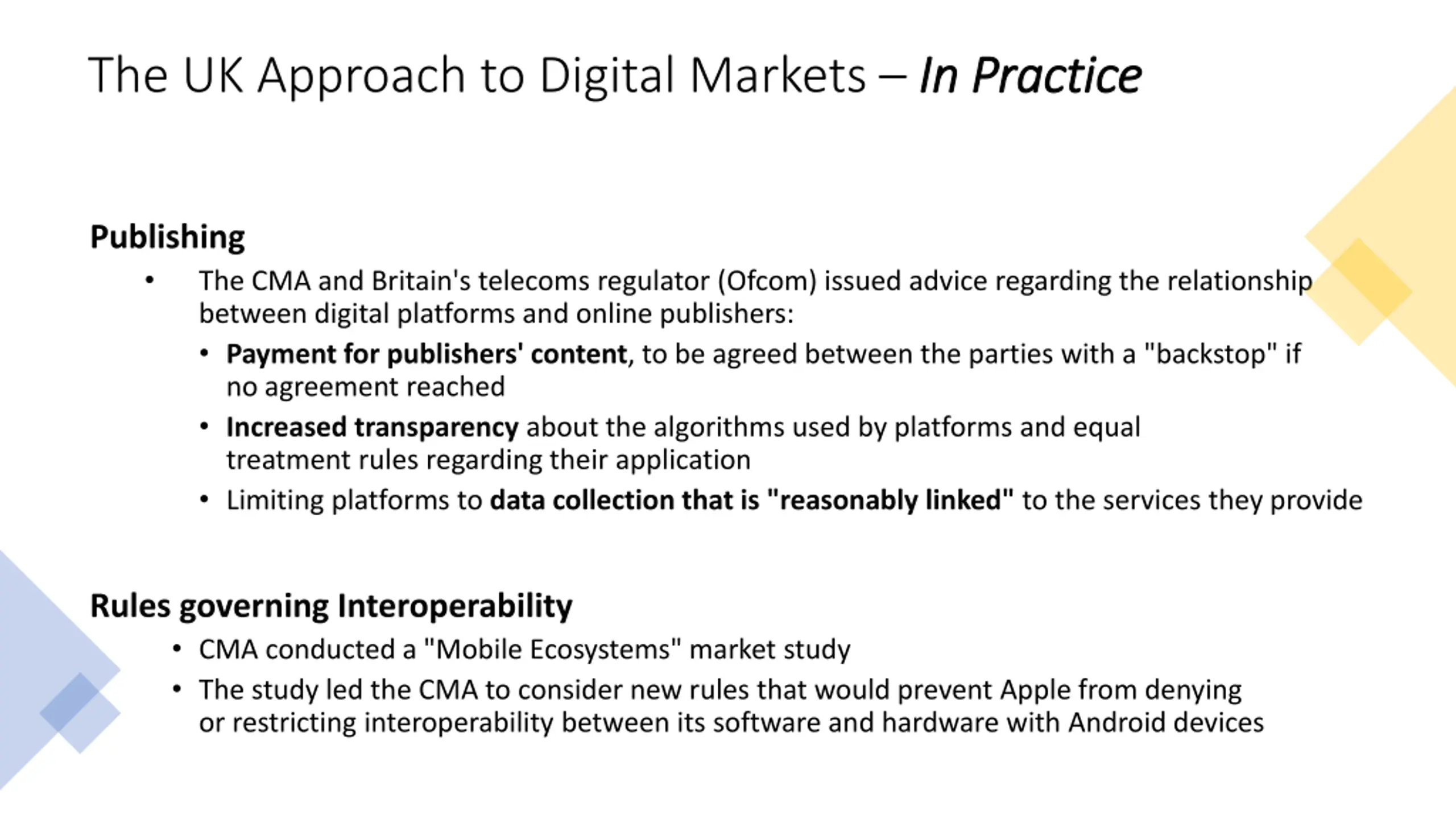 The UK Approach to Digital Markets In In Practice Practice Publishing The CMA and Britain's telecoms regulator (Ofcom) issued advice regarding the relationship between digital platforms and online publishers: Payment for publishers' content, to be agreed between the parties with a "backstop" if no agreement reached Increased transparency about the algorithms used by platforms and equal treatment rules regarding their application Limiting platforms to data collection that is "reasonably linked" to the services they provide Rules governing Interoperability CMA conducted a "Mobile Ecosystems" market study The study led the CMA to consider new rules that would prevent Apple from denying or restricting interoperability between its software and hardware with Android devices