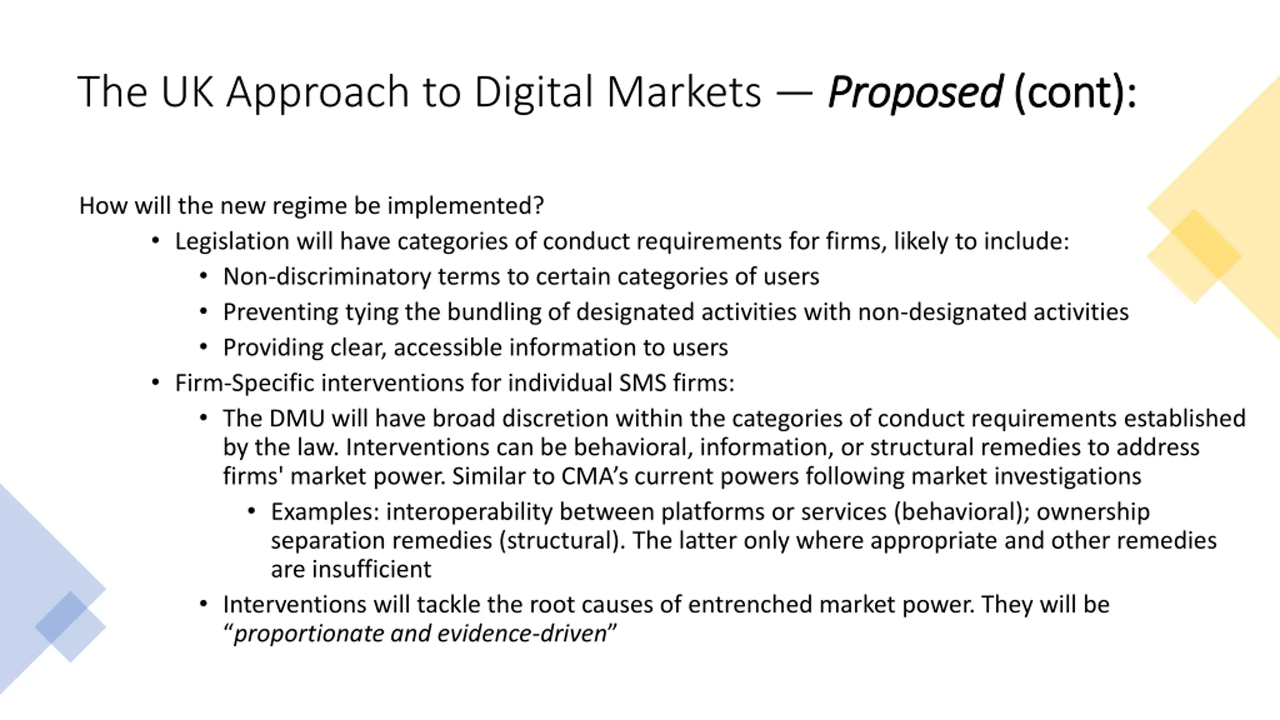 The UK Approach to Digital Markets Proposed Proposed ( (cont cont): ): How will the new regime be implemented? Legislation will have categories of conduct requirements for firms, likely to include: Non-discriminatory terms to certain categories of users Preventing tying the bundling of designated activities with non-designated activities Providing clear, accessible information to users Firm-Specific interventions for individual SMS firms: The DMU will have broad discretion within the categories of conduct requirements established by the law. Interventions can be behavioral, information, or structural remedies to address firms' market power. Similar to CMA s current powers following market investigations Examples: interoperability between platforms or services (behavioral); ownership separation remedies (structural). The latter only where appropriate and other remedies are insufficient Interventions will tackle the root causes of entrenched market power. They will be proportionate and evidence-driven