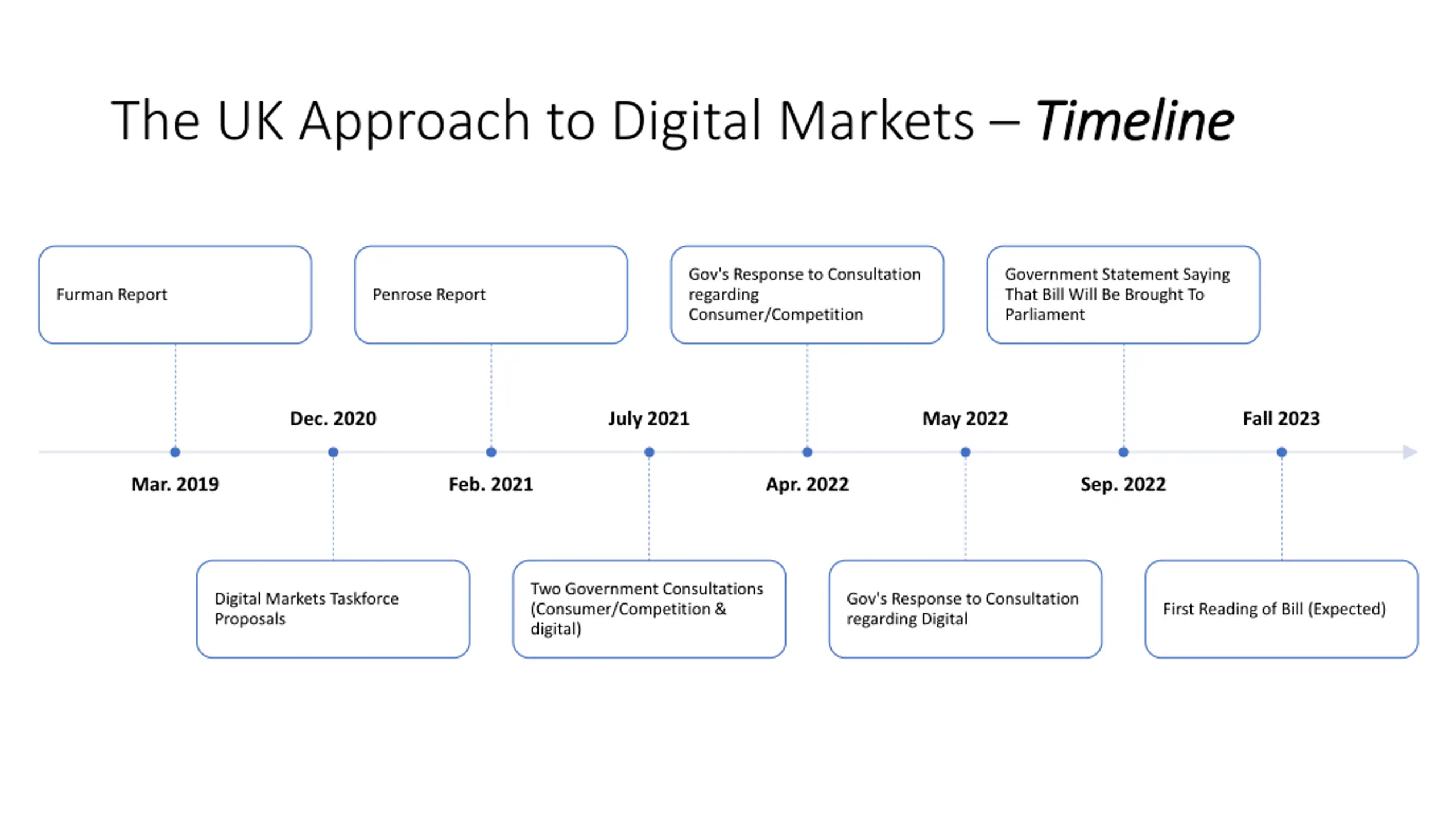 The UK Approach to Digital Markets Timeline Timeline Gov's Response to Consultation regarding Consumer/Competition Government Statement Saying That Bill Will Be Brought To Parliament Furman Report Penrose Report Dec. 2020 July 2021 May 2022 Fall 2023 Mar. 2019 Feb. 2021 Apr. 2022 Sep. 2022 Two Government Consultations (Consumer/Competition & digital) Digital Markets Taskforce Proposals Gov's Response to Consultation regarding Digital First Reading of Bill (Expected)