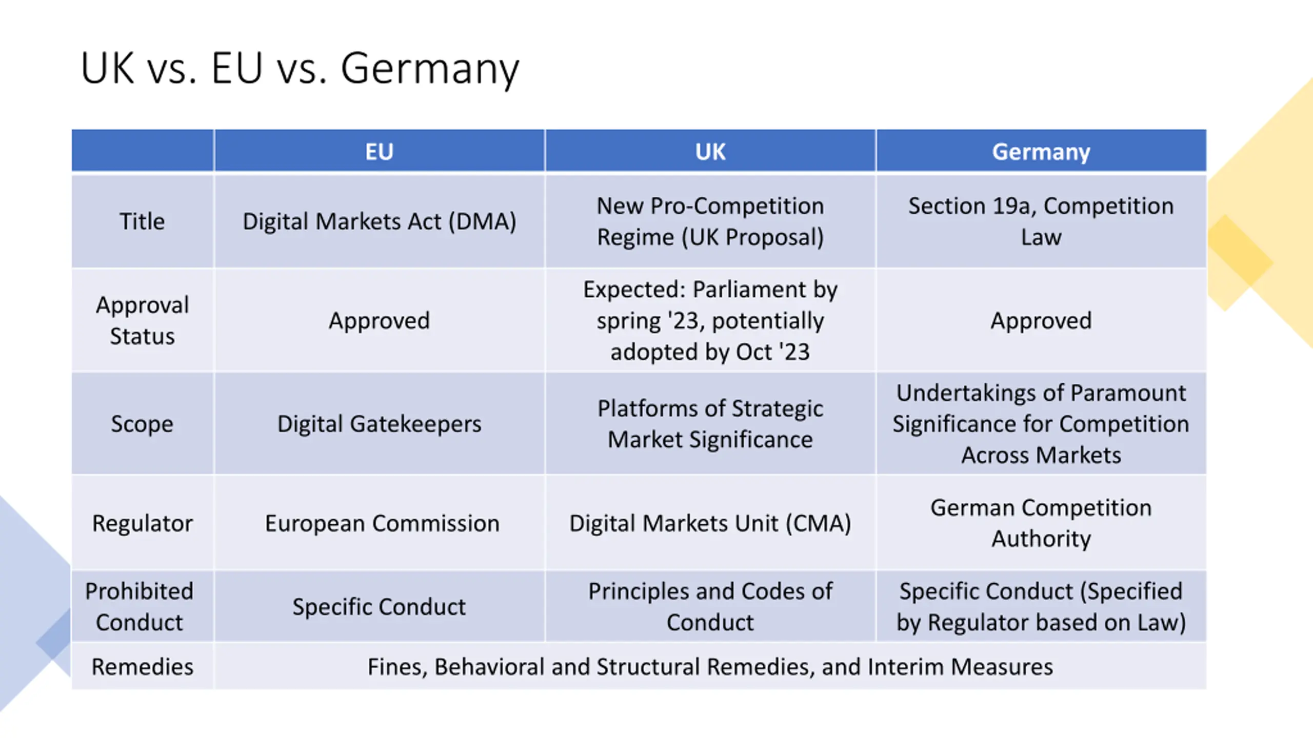 UK vs. EU vs. Germany EU UK Germany New Pro-Competition Regime (UK Proposal) Section 19a, Competition Law Title Digital Markets Act (DMA) Expected: Parliament by spring '23, potentially adopted by Oct '23 Approval Status Approved Approved Undertakings of Paramount Significance for Competition Across Markets Platforms of Strategic Market Significance Scope Digital Gatekeepers German Competition Authority Regulator European Commission Digital Markets Unit (CMA) Prohibited Conduct Principles and Codes of Conduct Specific Conduct (Specified by Regulator based on Law) Specific Conduct Remedies Fines, Behavioral and Structural Remedies, and Interim Measures