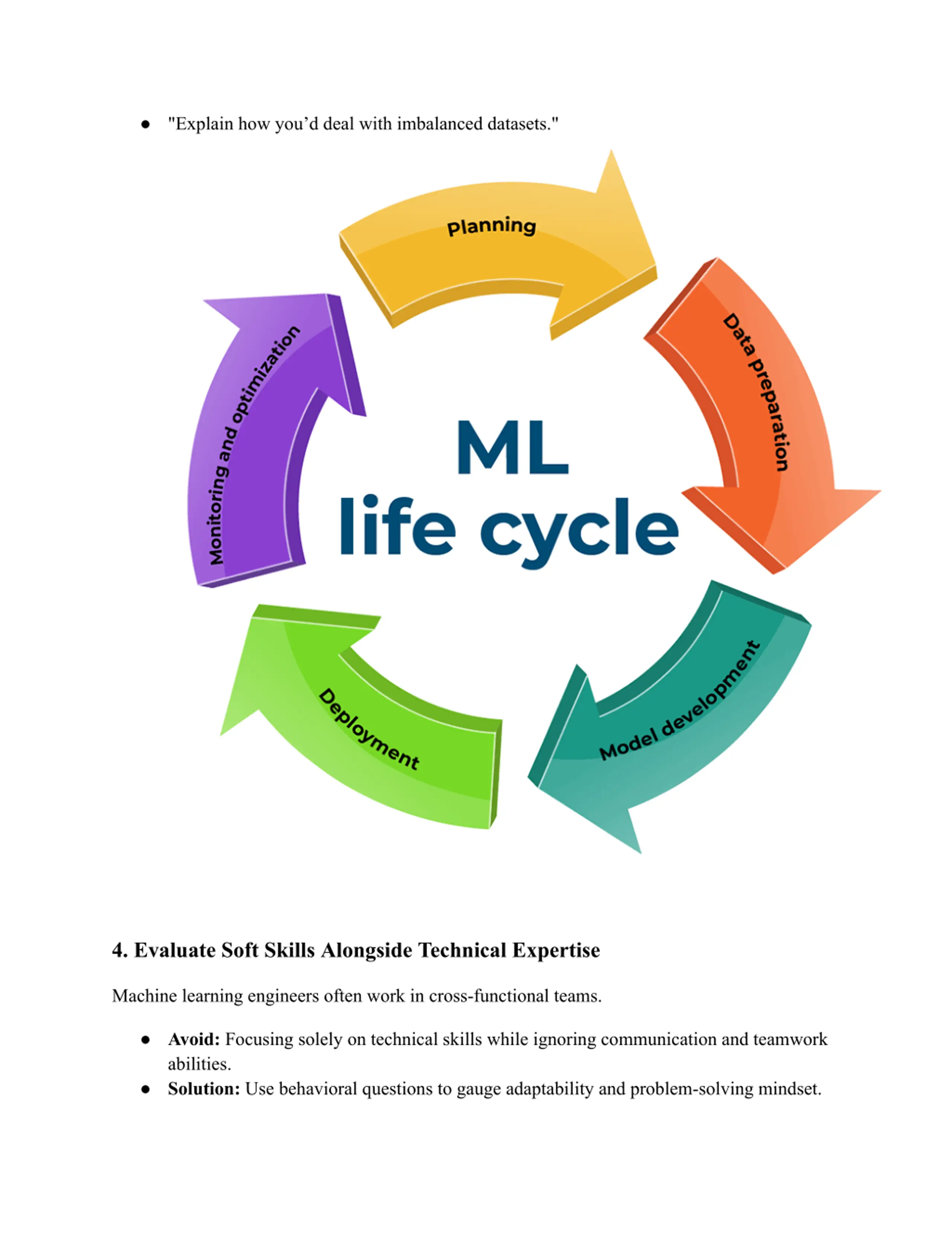 "Explain how youd deal with imbalanced datasets." 4. Evaluate Soft Skills Alongside Technical Expertise Machine learning engineers often work in cross-functional teams. Avoid: Focusing solely on technical skills while ignoring communication and teamwork abilities. Solution: Use behavioral questions to gauge adaptability and problem-solving mindset.
