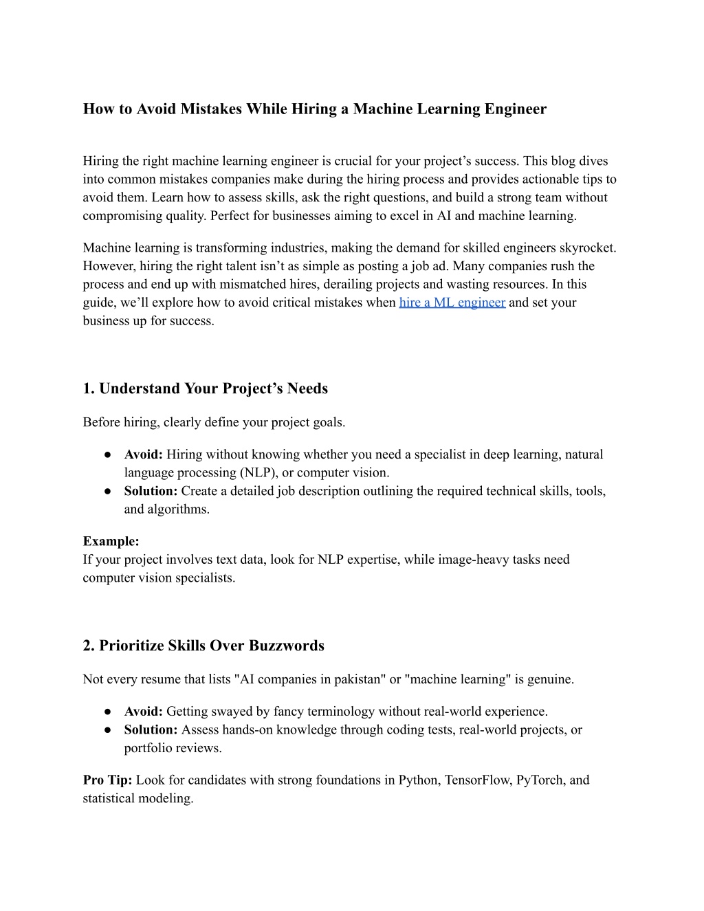 How to Avoid Mistakes While Hiring a Machine Learning Engineer Hiring the right machine learning engineer is crucial for your project s success. This blog dives into common mistakes companies make during the hiring process and provides actionable tips to avoid them. Learn how to assess skills, ask the right questions, and build a strong team without compromising quality. Perfect for businesses aiming to excel in AI and machine learning. Machine learning is transforming industries, making the demand for skilled engineers skyrocket. However, hiring the right talent isn t as simple as posting a job ad. Many companies rush the process and end up with mismatched hires, derailing projects and wasting resources. In this guide, we ll explore how to avoid critical mistakes when hire a ML engineer and set your business up for success. 1. Understand Your Project s Needs Before hiring, clearly define your project goals. Avoid: Hiring without knowing whether you need a specialist in deep learning, natural language processing (NLP), or computer vision. Solution: Create a detailed job description outlining the required technical skills, tools, and algorithms. Example: If your project involves text data, look for NLP expertise, while image-heavy tasks need computer vision specialists. 2. Prioritize Skills Over Buzzwords Not every resume that lists "AI companies in pakistan" or "machine learning" is genuine. Avoid: Getting swayed by fancy terminology without real-world experience. Solution: Assess hands-on knowledge through coding tests, real-world projects, or portfolio reviews. Pro Tip: Look for candidates with strong foundations in Python, TensorFlow, PyTorch, and statistical modeling.