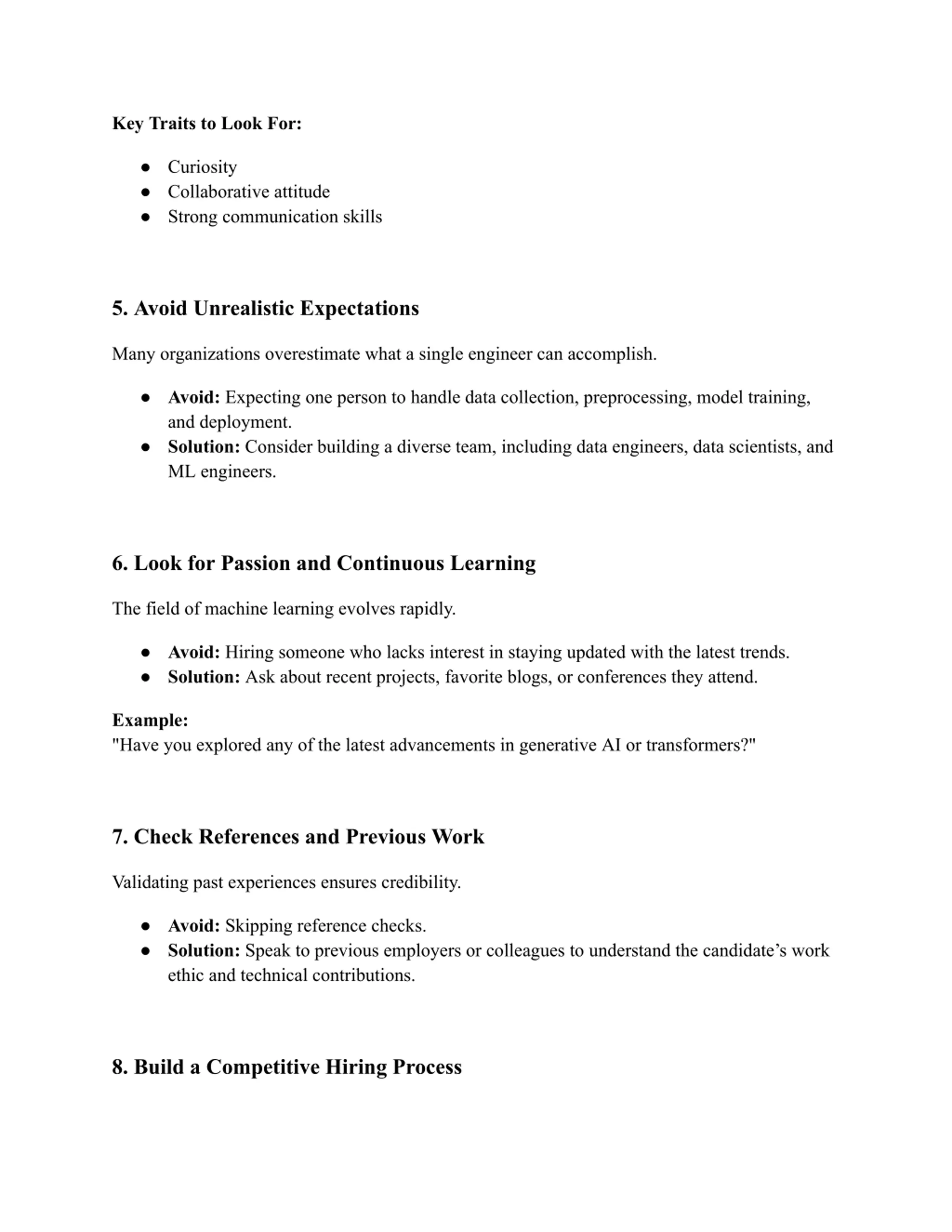 Key Traits to Look For: Curiosity Collaborative attitude Strong communication skills 5. Avoid Unrealistic Expectations Many organizations overestimate what a single engineer can accomplish. Avoid: Expecting one person to handle data collection, preprocessing, model training, and deployment. Solution: Consider building a diverse team, including data engineers, data scientists, and ML engineers. 6. Look for Passion and Continuous Learning The field of machine learning evolves rapidly. Avoid: Hiring someone who lacks interest in staying updated with the latest trends. Solution: Ask about recent projects, favorite blogs, or conferences they attend. Example: "Have you explored any of the latest advancements in generative AI or transformers?" 7. Check References and Previous Work Validating past experiences ensures credibility. Avoid: Skipping reference checks. Solution: Speak to previous employers or colleagues to understand the candidate s work ethic and technical contributions. 8. Build a Competitive Hiring Process