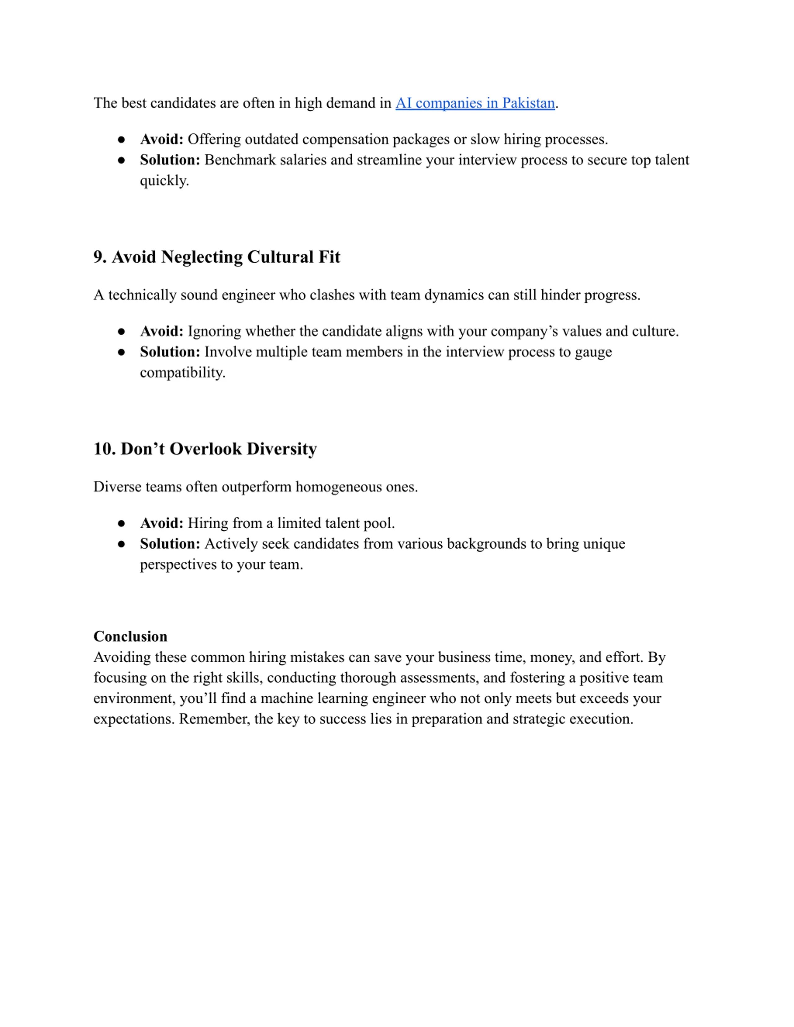 The best candidates are often in high demand in AI companies in Pakistan. Avoid: Offering outdated compensation packages or slow hiring processes. Solution: Benchmark salaries and streamline your interview process to secure top talent quickly. 9. Avoid Neglecting Cultural Fit A technically sound engineer who clashes with team dynamics can still hinder progress. Avoid: Ignoring whether the candidate aligns with your company s values and culture. Solution: Involve multiple team members in the interview process to gauge compatibility. 10. Don t Overlook Diversity Diverse teams often outperform homogeneous ones. Avoid: Hiring from a limited talent pool. Solution: Actively seek candidates from various backgrounds to bring unique perspectives to your team. Conclusion Avoiding these common hiring mistakes can save your business time, money, and effort. By focusing on the right skills, conducting thorough assessments, and fostering a positive team environment, you ll find a machine learning engineer who not only meets but exceeds your expectations. Remember, the key to success lies in preparation and strategic execution.