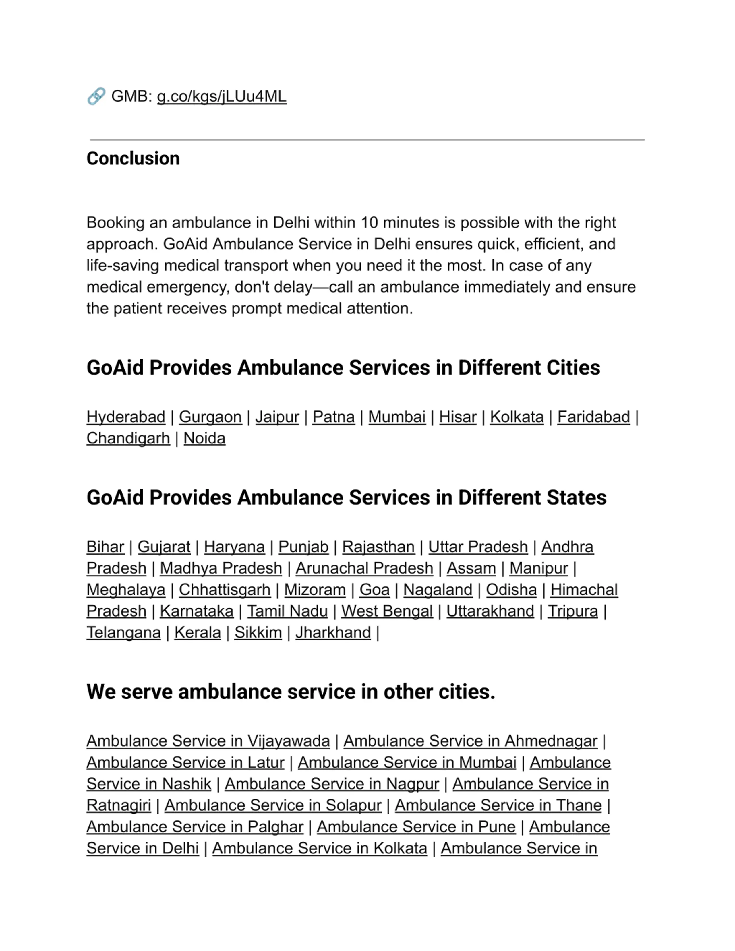 ? GMB: g.co/kgs/jLUu4ML Conclusion Booking an ambulance in Delhi within 10 minutes is possible with the right approach. GoAid Ambulance Service in Delhi ensures quick, efficient, and life-saving medical transport when you need it the most. In case of any medical emergency, don't delay call an ambulance immediately and ensure the patient receives prompt medical attention. GoAid Provides Ambulance Services in Different Cities Hyderabad | Gurgaon | Jaipur | Patna | Mumbai | Hisar | Kolkata | Faridabad | Chandigarh | Noida GoAid Provides Ambulance Services in Different States Bihar | Gujarat | Haryana | Punjab | Rajasthan | Uttar Pradesh | Andhra Pradesh | Madhya Pradesh | Arunachal Pradesh | Assam | Manipur | Meghalaya | Chhattisgarh | Mizoram | Goa | Nagaland | Odisha | Himachal Pradesh | Karnataka | Tamil Nadu | West Bengal | Uttarakhand | Tripura | Telangana | Kerala | Sikkim | Jharkhand | We serve ambulance service in other cities. Ambulance Service in Vijayawada | Ambulance Service in Ahmednagar | Ambulance Service in Latur | Ambulance Service in Mumbai | Ambulance Service in Nashik | Ambulance Service in Nagpur | Ambulance Service in Ratnagiri | Ambulance Service in Solapur | Ambulance Service in Thane | Ambulance Service in Palghar | Ambulance Service in Pune | Ambulance Service in Delhi | Ambulance Service in Kolkata | Ambulance Service in