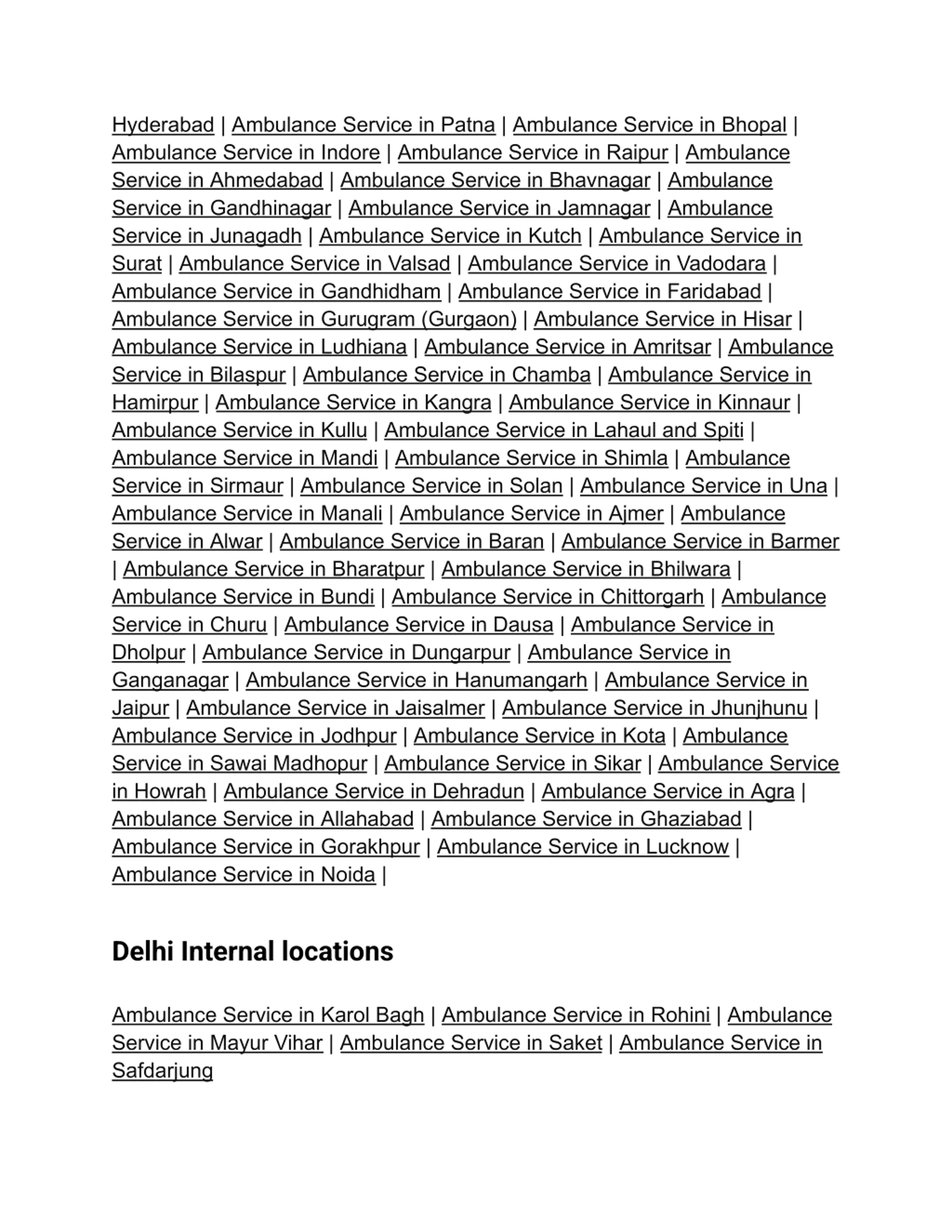 Hyderabad | Ambulance Service in Patna | Ambulance Service in Bhopal | Ambulance Service in Indore | Ambulance Service in Raipur | Ambulance Service in Ahmedabad | Ambulance Service in Bhavnagar | Ambulance Service in Gandhinagar | Ambulance Service in Jamnagar | Ambulance Service in Junagadh | Ambulance Service in Kutch | Ambulance Service in Surat | Ambulance Service in Valsad | Ambulance Service in Vadodara | Ambulance Service in Gandhidham | Ambulance Service in Faridabad | Ambulance Service in Gurugram (Gurgaon) | Ambulance Service in Hisar | Ambulance Service in Ludhiana | Ambulance Service in Amritsar | Ambulance Service in Bilaspur | Ambulance Service in Chamba | Ambulance Service in Hamirpur | Ambulance Service in Kangra | Ambulance Service in Kinnaur | Ambulance Service in Kullu | Ambulance Service in Lahaul and Spiti | Ambulance Service in Mandi | Ambulance Service in Shimla | Ambulance Service in Sirmaur | Ambulance Service in Solan | Ambulance Service in Una | Ambulance Service in Manali | Ambulance Service in Ajmer | Ambulance Service in Alwar | Ambulance Service in Baran | Ambulance Service in Barmer | Ambulance Service in Bharatpur | Ambulance Service in Bhilwara | Ambulance Service in Bundi | Ambulance Service in Chittorgarh | Ambulance Service in Churu | Ambulance Service in Dausa | Ambulance Service in Dholpur | Ambulance Service in Dungarpur | Ambulance Service in Ganganagar | Ambulance Service in Hanumangarh | Ambulance Service in Jaipur | Ambulance Service in Jaisalmer | Ambulance Service in Jhunjhunu | Ambulance Service in Jodhpur | Ambulance Service in Kota | Ambulance Service in Sawai Madhopur | Ambulance Service in Sikar | Ambulance Service in Howrah | Ambulance Service in Dehradun | Ambulance Service in Agra | Ambulance Service in Allahabad | Ambulance Service in Ghaziabad | Ambulance Service in Gorakhpur | Ambulance Service in Lucknow | Ambulance Service in Noida | Delhi Internal locations Ambulance Service in Karol Bagh | Ambulance Service in Rohini | Ambulance Service in Mayur Vihar | Ambulance Service in Saket | Ambulance Service in Safdarjung