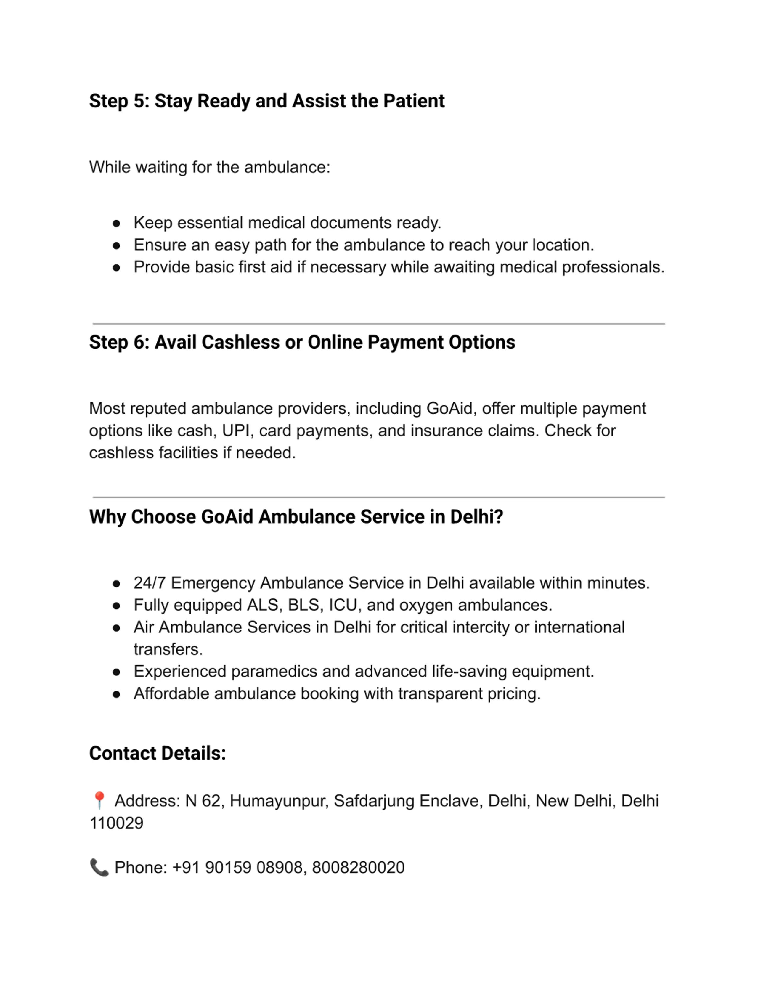 Step 5: Stay Ready and Assist the Patient While waiting for the ambulance: Keep essential medical documents ready. Ensure an easy path for the ambulance to reach your location. Provide basic first aid if necessary while awaiting medical professionals. Step 6: Avail Cashless or Online Payment Options Most reputed ambulance providers, including GoAid, offer multiple payment options like cash, UPI, card payments, and insurance claims. Check for cashless facilities if needed. Why Choose GoAid Ambulance Service in Delhi? 24/7 Emergency Ambulance Service in Delhi available within minutes. Fully equipped ALS, BLS, ICU, and oxygen ambulances. Air Ambulance Services in Delhi for critical intercity or international transfers. Experienced paramedics and advanced life-saving equipment. Affordable ambulance booking with transparent pricing. Contact Details: ? Address: N 62, Humayunpur, Safdarjung Enclave, Delhi, New Delhi, Delhi 110029 ? Phone: +91 90159 08908, 8008280020