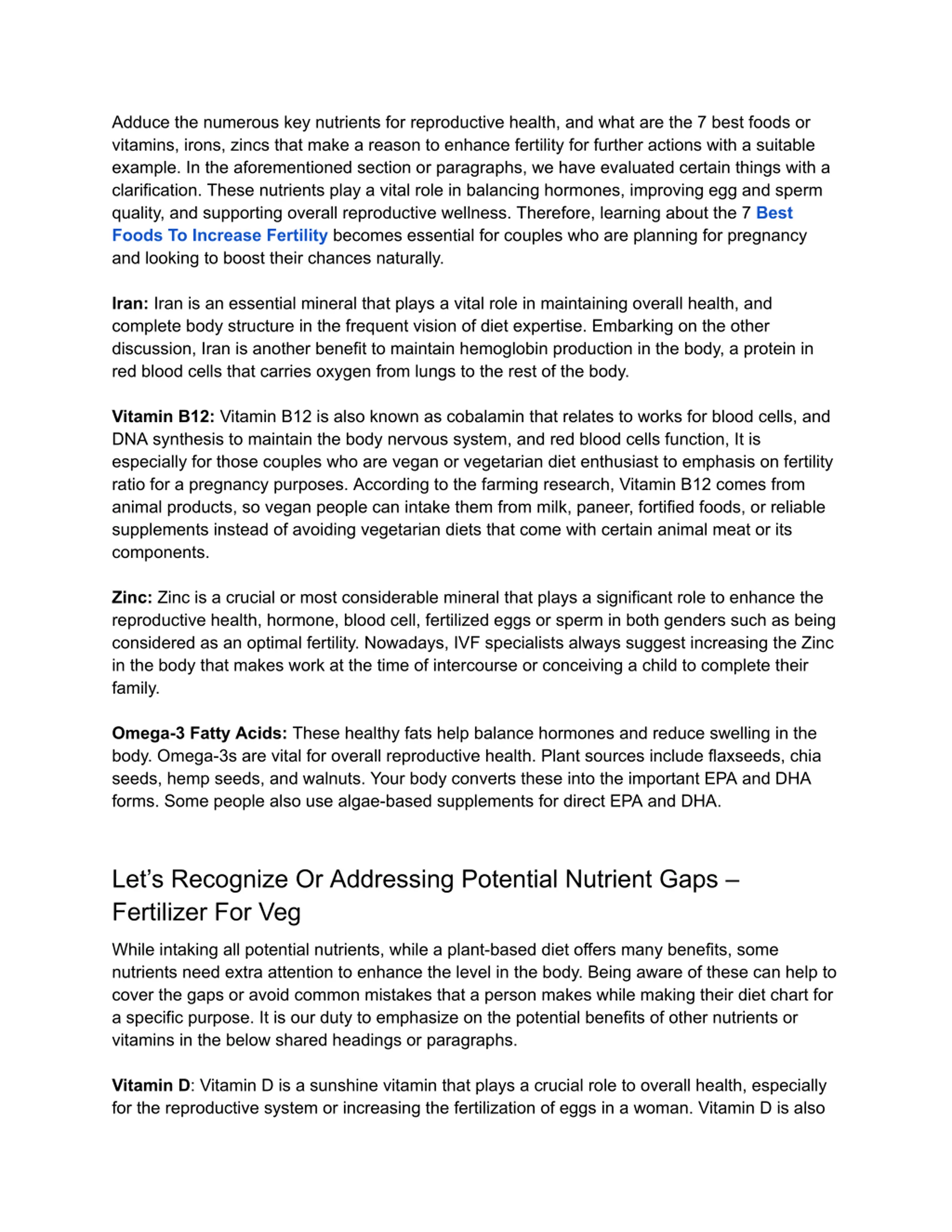 Adduce the numerous key nutrients for reproductive health, and what are the 7 best foods or vitamins, irons, zincs that make a reason to enhance fertility for further actions with a suitable example. In the aforementioned section or paragraphs, we have evaluated certain things with a clarification. These nutrients play a vital role in balancing hormones, improving egg and sperm quality, and supporting overall reproductive wellness. Therefore, learning about the 7 Best Foods To Increase Fertility becomes essential for couples who are planning for pregnancy and looking to boost their chances naturally. Iran: Iran is an essential mineral that plays a vital role in maintaining overall health, and complete body structure in the frequent vision of diet expertise. Embarking on the other discussion, Iran is another benefit to maintain hemoglobin production in the body, a protein in red blood cells that carries oxygen from lungs to the rest of the body. Vitamin B12: Vitamin B12 is also known as cobalamin that relates to works for blood cells, and DNA synthesis to maintain the body nervous system, and red blood cells function, It is especially for those couples who are vegan or vegetarian diet enthusiast to emphasis on fertility ratio for a pregnancy purposes. According to the farming research, Vitamin B12 comes from animal products, so vegan people can intake them from milk, paneer, fortified foods, or reliable supplements instead of avoiding vegetarian diets that come with certain animal meat or its components. Zinc: Zinc is a crucial or most considerable mineral that plays a significant role to enhance the reproductive health, hormone, blood cell, fertilized eggs or sperm in both genders such as being considered as an optimal fertility. Nowadays, IVF specialists always suggest increasing the Zinc in the body that makes work at the time of intercourse or conceiving a child to complete their family. Omega-3 Fatty Acids: These healthy fats help balance hormones and reduce swelling in the body. Omega-3s are vital for overall reproductive health. Plant sources include flaxseeds, chia seeds, hemp seeds, and walnuts. Your body converts these into the important EPA and DHA forms. Some people also use algae-based supplements for direct EPA and DHA. Let s Recognize Or Addressing Potential Nutrient Gaps Fertilizer For Veg While intaking all potential nutrients, while a plant-based diet offers many benefits, some nutrients need extra attention to enhance the level in the body. Being aware of these can help to cover the gaps or avoid common mistakes that a person makes while making their diet chart for a specific purpose. It is our duty to emphasize on the potential benefits of other nutrients or vitamins in the below shared headings or paragraphs. Vitamin D: Vitamin D is a sunshine vitamin that plays a crucial role to overall health, especially for the reproductive system or increasing the fertilization of eggs in a woman. Vitamin D is also