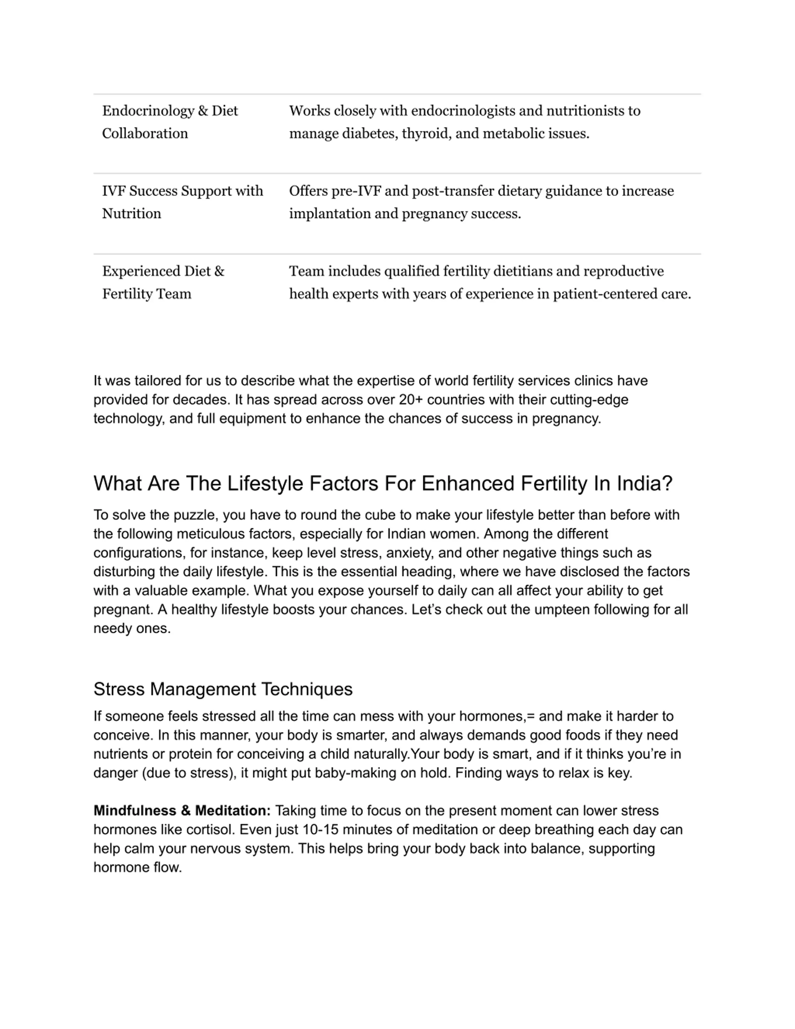 Endocrinology & Diet Collaboration Works closely with endocrinologists and nutritionists to manage diabetes, thyroid, and metabolic issues. IVF Success Support with Nutrition Offers pre-IVF and post-transfer dietary guidance to increase implantation and pregnancy success. Experienced Diet & Fertility Team Team includes qualified fertility dietitians and reproductive health experts with years of experience in patient-centered care. It was tailored for us to describe what the expertise of world fertility services clinics have provided for decades. It has spread across over 20+ countries with their cutting-edge technology, and full equipment to enhance the chances of success in pregnancy. What Are The Lifestyle Factors For Enhanced Fertility In India? To solve the puzzle, you have to round the cube to make your lifestyle better than before with the following meticulous factors, especially for Indian women. Among the different configurations, for instance, keep level stress, anxiety, and other negative things such as disturbing the daily lifestyle. This is the essential heading, where we have disclosed the factors with a valuable example. What you expose yourself to daily can all affect your ability to get pregnant. A healthy lifestyle boosts your chances. Let s check out the umpteen following for all needy ones. Stress Management Techniques If someone feels stressed all the time can mess with your hormones,= and make it harder to conceive. In this manner, your body is smarter, and always demands good foods if they need nutrients or protein for conceiving a child naturally.Your body is smart, and if it thinks you re in danger (due to stress), it might put baby-making on hold. Finding ways to relax is key. Mindfulness & Meditation: Taking time to focus on the present moment can lower stress hormones like cortisol. Even just 10-15 minutes of meditation or deep breathing each day can help calm your nervous system. This helps bring your body back into balance, supporting hormone flow.