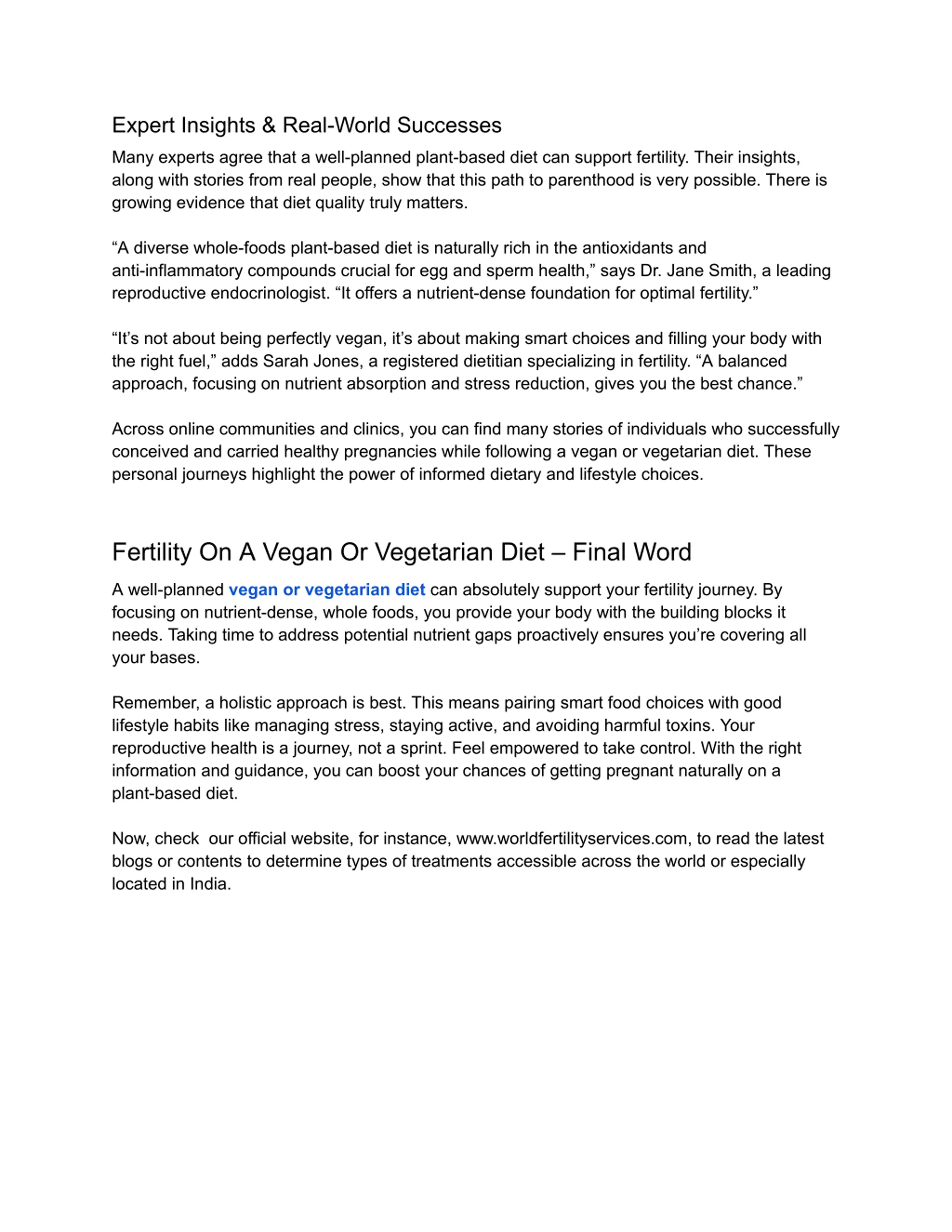 Expert Insights & Real-World Successes Many experts agree that a well-planned plant-based diet can support fertility. Their insights, along with stories from real people, show that this path to parenthood is very possible. There is growing evidence that diet quality truly matters. A diverse whole-foods plant-based diet is naturally rich in the antioxidants and anti-inflammatory compounds crucial for egg and sperm health, says Dr. Jane Smith, a leading reproductive endocrinologist. It offers a nutrient-dense foundation for optimal fertility. It s not about being perfectly vegan, it s about making smart choices and filling your body with the right fuel, adds Sarah Jones, a registered dietitian specializing in fertility. A balanced approach, focusing on nutrient absorption and stress reduction, gives you the best chance. Across online communities and clinics, you can find many stories of individuals who successfully conceived and carried healthy pregnancies while following a vegan or vegetarian diet. These personal journeys highlight the power of informed dietary and lifestyle choices. Fertility On A Vegan Or Vegetarian Diet Final Word A well-planned vegan or vegetarian diet can absolutely support your fertility journey. By focusing on nutrient-dense, whole foods, you provide your body with the building blocks it needs. Taking time to address potential nutrient gaps proactively ensures you re covering all your bases. Remember, a holistic approach is best. This means pairing smart food choices with good lifestyle habits like managing stress, staying active, and avoiding harmful toxins. Your reproductive health is a journey, not a sprint. Feel empowered to take control. With the right information and guidance, you can boost your chances of getting pregnant naturally on a plant-based diet. Now, check our official website, for instance, www.worldfertilityservices.com, to read the latest blogs or contents to determine types of treatments accessible across the world or especially located in India.