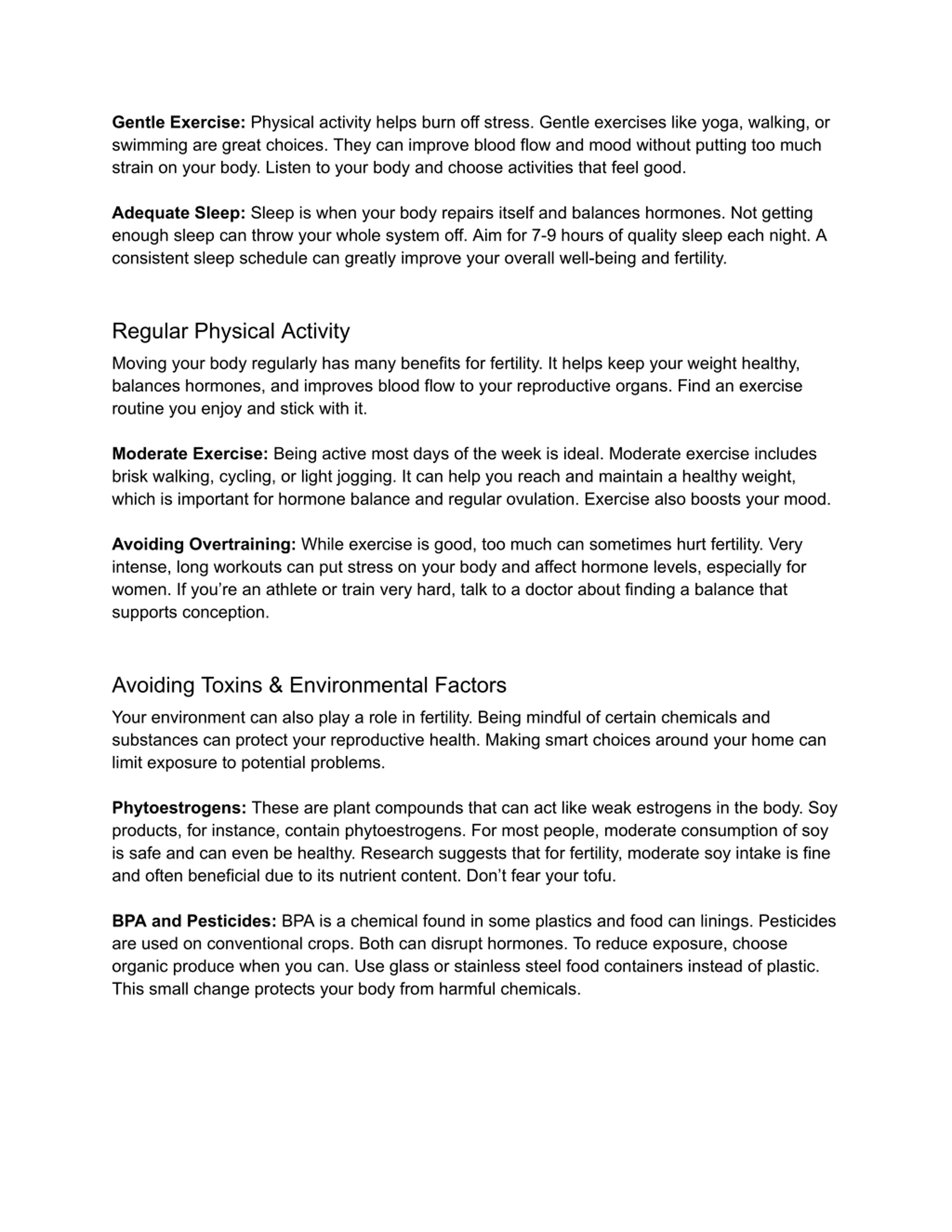 Gentle Exercise: Physical activity helps burn off stress. Gentle exercises like yoga, walking, or swimming are great choices. They can improve blood flow and mood without putting too much strain on your body. Listen to your body and choose activities that feel good. Adequate Sleep: Sleep is when your body repairs itself and balances hormones. Not getting enough sleep can throw your whole system off. Aim for 7-9 hours of quality sleep each night. A consistent sleep schedule can greatly improve your overall well-being and fertility. Regular Physical Activity Moving your body regularly has many benefits for fertility. It helps keep your weight healthy, balances hormones, and improves blood flow to your reproductive organs. Find an exercise routine you enjoy and stick with it. Moderate Exercise: Being active most days of the week is ideal. Moderate exercise includes brisk walking, cycling, or light jogging. It can help you reach and maintain a healthy weight, which is important for hormone balance and regular ovulation. Exercise also boosts your mood. Avoiding Overtraining: While exercise is good, too much can sometimes hurt fertility. Very intense, long workouts can put stress on your body and affect hormone levels, especially for women. If you re an athlete or train very hard, talk to a doctor about finding a balance that supports conception. Avoiding Toxins & Environmental Factors Your environment can also play a role in fertility. Being mindful of certain chemicals and substances can protect your reproductive health. Making smart choices around your home can limit exposure to potential problems. Phytoestrogens: These are plant compounds that can act like weak estrogens in the body. Soy products, for instance, contain phytoestrogens. For most people, moderate consumption of soy is safe and can even be healthy. Research suggests that for fertility, moderate soy intake is fine and often beneficial due to its nutrient content. Don t fear your tofu. BPA and Pesticides: BPA is a chemical found in some plastics and food can linings. Pesticides are used on conventional crops. Both can disrupt hormones. To reduce exposure, choose organic produce when you can. Use glass or stainless steel food containers instead of plastic. This small change protects your body from harmful chemicals.