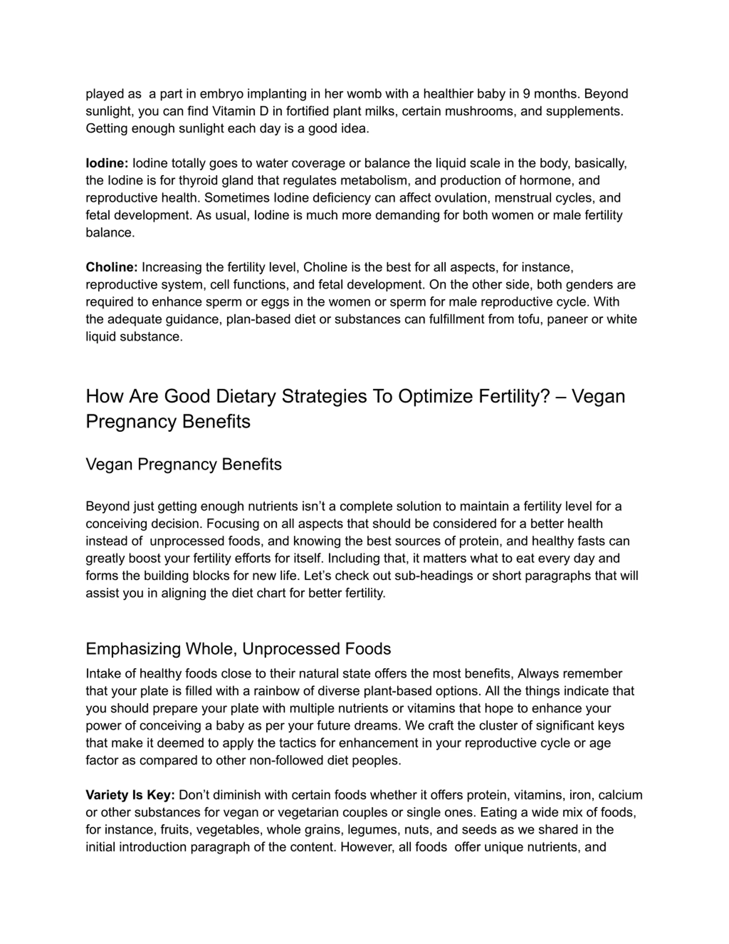 played as a part in embryo implanting in her womb with a healthier baby in 9 months. Beyond sunlight, you can find Vitamin D in fortified plant milks, certain mushrooms, and supplements. Getting enough sunlight each day is a good idea. Iodine: Iodine totally goes to water coverage or balance the liquid scale in the body, basically, the Iodine is for thyroid gland that regulates metabolism, and production of hormone, and reproductive health. Sometimes Iodine deficiency can affect ovulation, menstrual cycles, and fetal development. As usual, Iodine is much more demanding for both women or male fertility balance. Choline: Increasing the fertility level, Choline is the best for all aspects, for instance, reproductive system, cell functions, and fetal development. On the other side, both genders are required to enhance sperm or eggs in the women or sperm for male reproductive cycle. With the adequate guidance, plan-based diet or substances can fulfillment from tofu, paneer or white liquid substance. How Are Good Dietary Strategies To Optimize Fertility? Vegan Pregnancy Benefits Vegan Pregnancy Benefits Beyond just getting enough nutrients isn t a complete solution to maintain a fertility level for a conceiving decision. Focusing on all aspects that should be considered for a better health instead of unprocessed foods, and knowing the best sources of protein, and healthy fasts can greatly boost your fertility efforts for itself. Including that, it matters what to eat every day and forms the building blocks for new life. Let s check out sub-headings or short paragraphs that will assist you in aligning the diet chart for better fertility. Emphasizing Whole, Unprocessed Foods Intake of healthy foods close to their natural state offers the most benefits, Always remember that your plate is filled with a rainbow of diverse plant-based options. All the things indicate that you should prepare your plate with multiple nutrients or vitamins that hope to enhance your power of conceiving a baby as per your future dreams. We craft the cluster of significant keys that make it deemed to apply the tactics for enhancement in your reproductive cycle or age factor as compared to other non-followed diet peoples. Variety Is Key: Don t diminish with certain foods whether it offers protein, vitamins, iron, calcium or other substances for vegan or vegetarian couples or single ones. Eating a wide mix of foods, for instance, fruits, vegetables, whole grains, legumes, nuts, and seeds as we shared in the initial introduction paragraph of the content. However, all foods offer unique nutrients, and