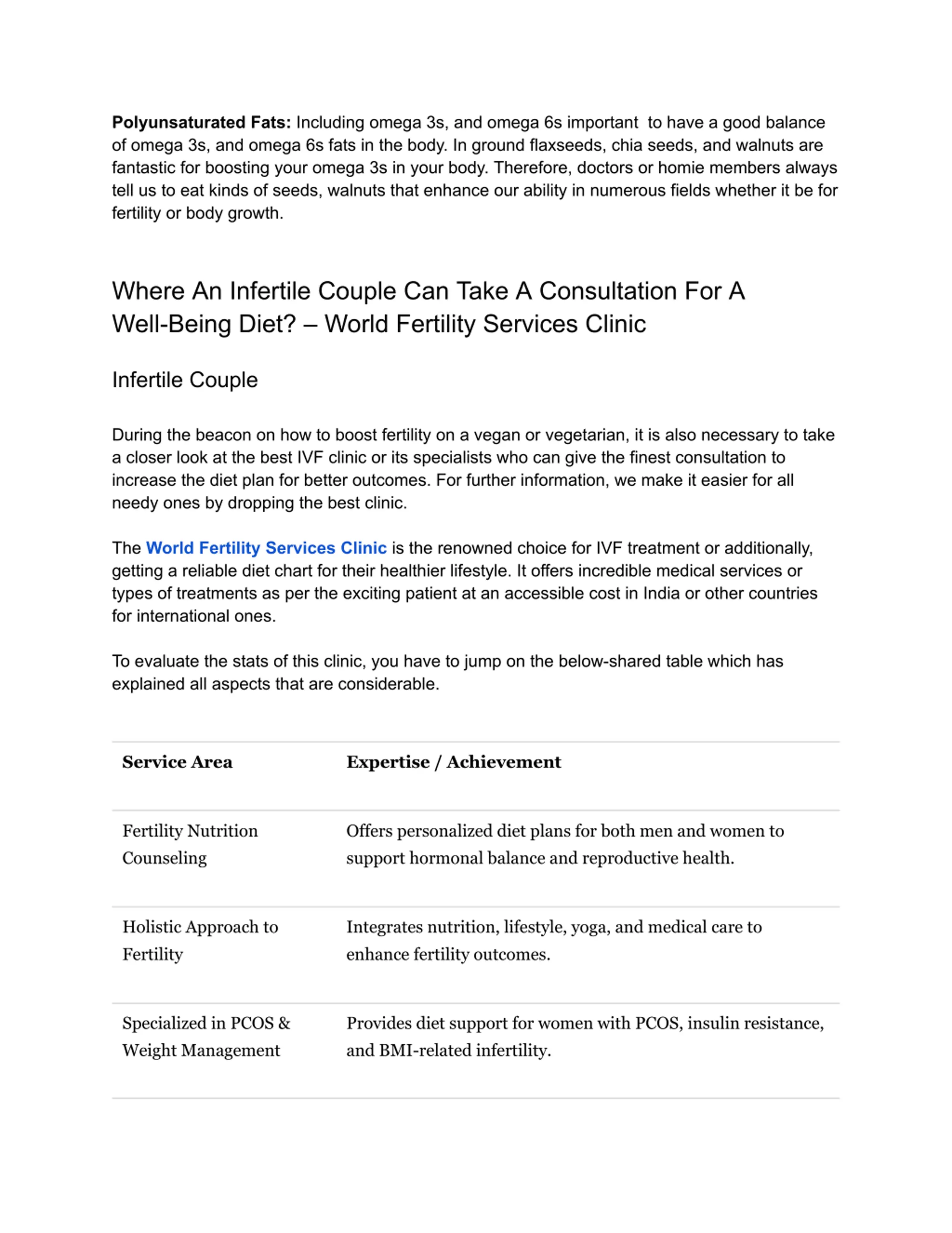 Polyunsaturated Fats: Including omega 3s, and omega 6s important to have a good balance of omega 3s, and omega 6s fats in the body. In ground flaxseeds, chia seeds, and walnuts are fantastic for boosting your omega 3s in your body. Therefore, doctors or homie members always tell us to eat kinds of seeds, walnuts that enhance our ability in numerous fields whether it be for fertility or body growth. Where An Infertile Couple Can Take A Consultation For A Well-Being Diet? World Fertility Services Clinic Infertile Couple During the beacon on how to boost fertility on a vegan or vegetarian, it is also necessary to take a closer look at the best IVF clinic or its specialists who can give the finest consultation to increase the diet plan for better outcomes. For further information, we make it easier for all needy ones by dropping the best clinic. The World Fertility Services Clinic is the renowned choice for IVF treatment or additionally, getting a reliable diet chart for their healthier lifestyle. It offers incredible medical services or types of treatments as per the exciting patient at an accessible cost in India or other countries for international ones. To evaluate the stats of this clinic, you have to jump on the below-shared table which has explained all aspects that are considerable. Service Area Expertise / Achievement Fertility Nutrition Counseling Offers personalized diet plans for both men and women to support hormonal balance and reproductive health. Holistic Approach to Fertility Integrates nutrition, lifestyle, yoga, and medical care to enhance fertility outcomes. Specialized in PCOS & Weight Management Provides diet support for women with PCOS, insulin resistance, and BMI-related infertility.