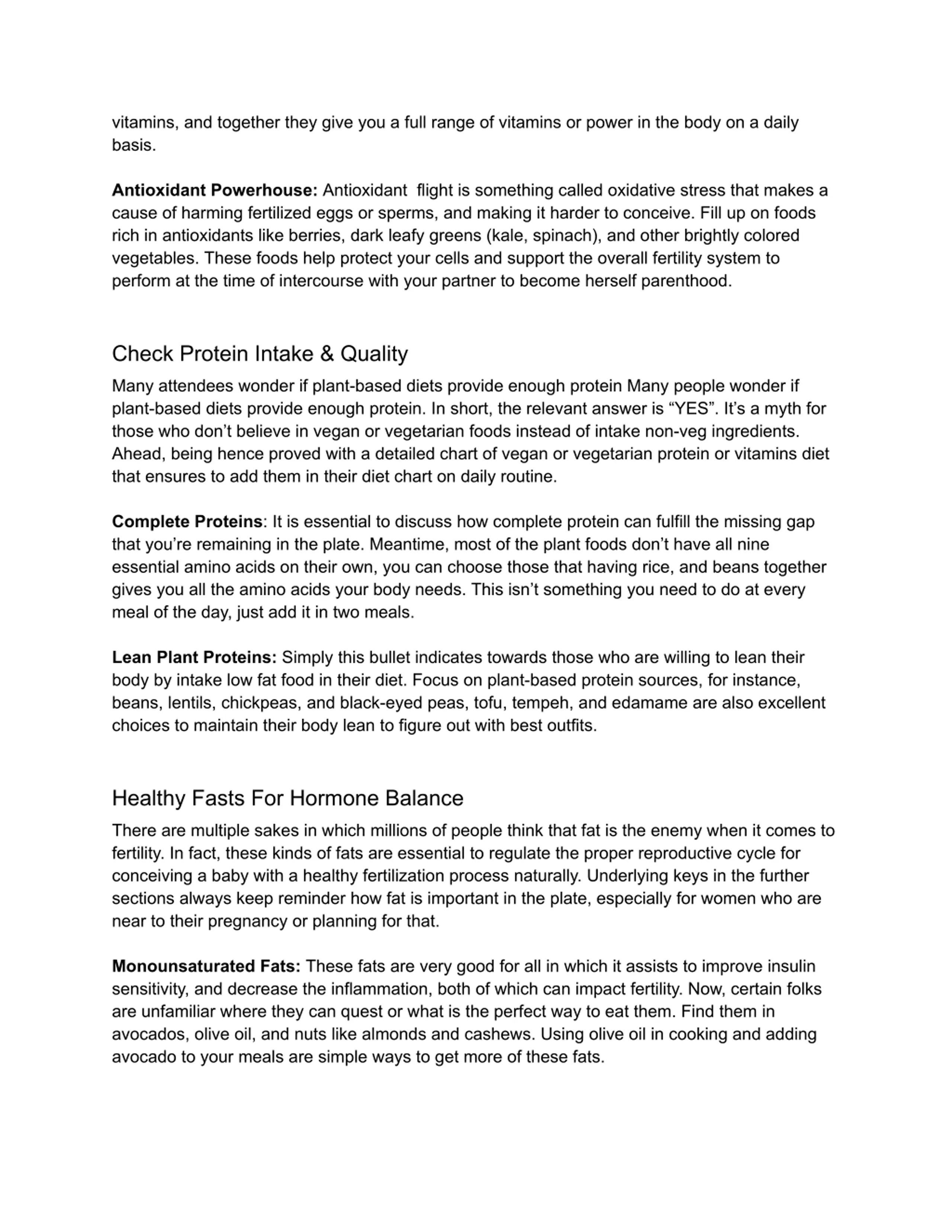 vitamins, and together they give you a full range of vitamins or power in the body on a daily basis. Antioxidant Powerhouse: Antioxidant flight is something called oxidative stress that makes a cause of harming fertilized eggs or sperms, and making it harder to conceive. Fill up on foods rich in antioxidants like berries, dark leafy greens (kale, spinach), and other brightly colored vegetables. These foods help protect your cells and support the overall fertility system to perform at the time of intercourse with your partner to become herself parenthood. Check Protein Intake & Quality Many attendees wonder if plant-based diets provide enough protein Many people wonder if plant-based diets provide enough protein. In short, the relevant answer is YES . It s a myth for those who don t believe in vegan or vegetarian foods instead of intake non-veg ingredients. Ahead, being hence proved with a detailed chart of vegan or vegetarian protein or vitamins diet that ensures to add them in their diet chart on daily routine. Complete Proteins: It is essential to discuss how complete protein can fulfill the missing gap that you re remaining in the plate. Meantime, most of the plant foods don t have all nine essential amino acids on their own, you can choose those that having rice, and beans together gives you all the amino acids your body needs. This isn t something you need to do at every meal of the day, just add it in two meals. Lean Plant Proteins: Simply this bullet indicates towards those who are willing to lean their body by intake low fat food in their diet. Focus on plant-based protein sources, for instance, beans, lentils, chickpeas, and black-eyed peas, tofu, tempeh, and edamame are also excellent choices to maintain their body lean to figure out with best outfits. Healthy Fasts For Hormone Balance There are multiple sakes in which millions of people think that fat is the enemy when it comes to fertility. In fact, these kinds of fats are essential to regulate the proper reproductive cycle for conceiving a baby with a healthy fertilization process naturally. Underlying keys in the further sections always keep reminder how fat is important in the plate, especially for women who are near to their pregnancy or planning for that. Monounsaturated Fats: These fats are very good for all in which it assists to improve insulin sensitivity, and decrease the inflammation, both of which can impact fertility. Now, certain folks are unfamiliar where they can quest or what is the perfect way to eat them. Find them in avocados, olive oil, and nuts like almonds and cashews. Using olive oil in cooking and adding avocado to your meals are simple ways to get more of these fats.