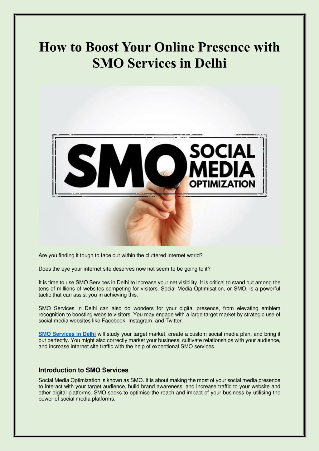 How to Boost Your Online Presence with SMO Services in Delhi Are you finding it tough to face out within the cluttered internet world? Does the eye your internet site deserves now not seem to be going to it? It is time to use SMO Services in Delhi to increase your net visibility. It is critical to stand out among the tens of millions of websites competing for visitors. Social Media Optimisation, or SMO, is a powerful tactic that can assist you in achieving this. SMO Services in Delhi can also do wonders for your digital presence, from elevating emblem recognition to boosting website visitors. You may engage with a large target market by strategic use of social media websites like Facebook, Instagram, and Twitter. SMO Services in Delhi will study your target market, create a custom social media plan, and bring it out perfectly. You might also correctly market your business, cultivate relationships with your audience, and increase internet site traffic with the help of exceptional SMO services. Introduction to SMO Services Social Media Optimization is known as SMO. It is about making the most of your social media presence to interact with your target audience, build brand awareness, and increase traffic to your website and other digital platforms. SMO seeks to optimise the reach and impact of your business by utilising the power of social media platforms.