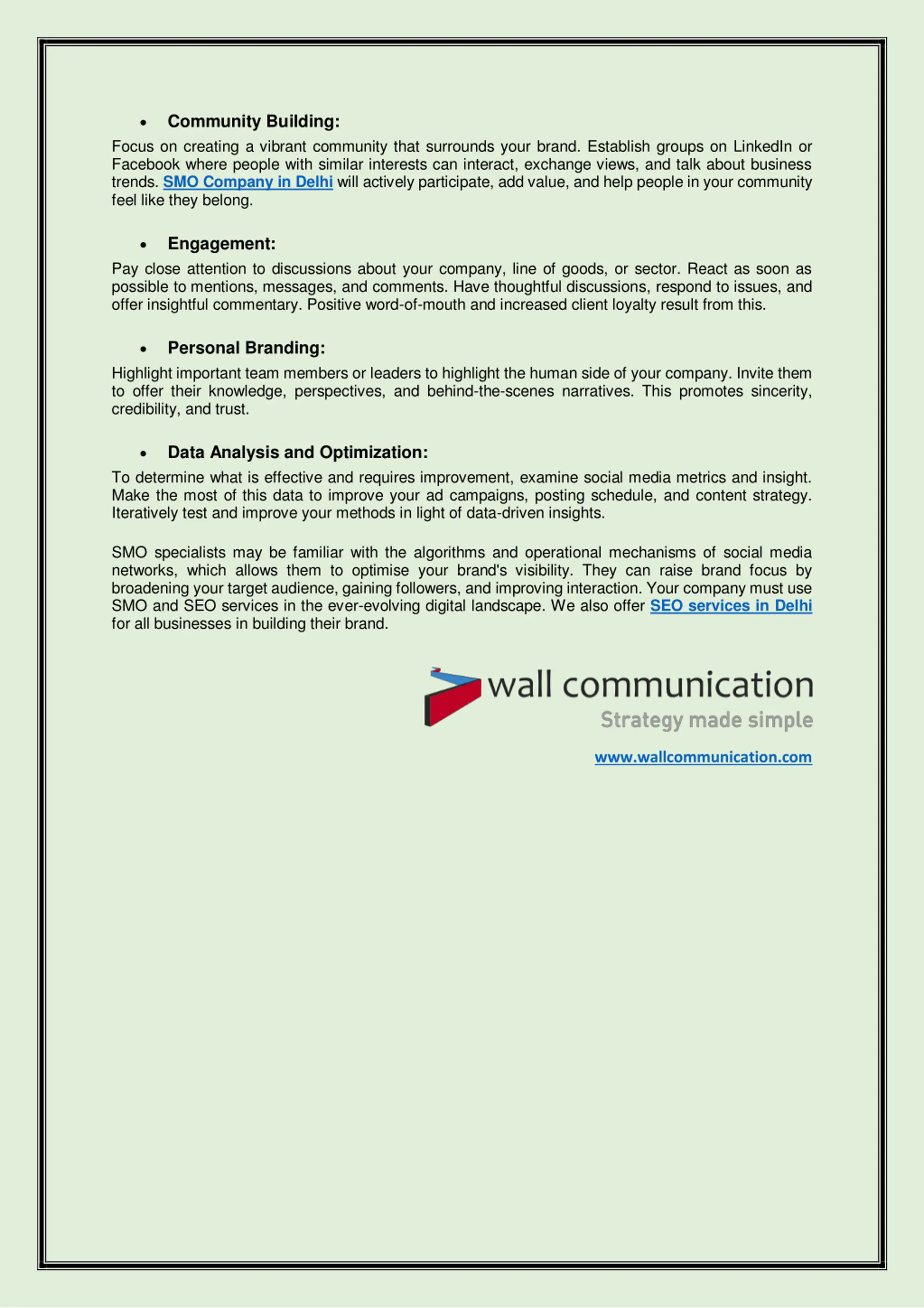 Community Building: Focus on creating a vibrant community that surrounds your brand. Establish groups on LinkedIn or Facebook where people with similar interests can interact, exchange views, and talk about business trends. SMO Company in Delhi will actively participate, add value, and help people in your community feel like they belong. Engagement: Pay close attention to discussions about your company, line of goods, or sector. React as soon as possible to mentions, messages, and comments. Have thoughtful discussions, respond to issues, and offer insightful commentary. Positive word-of-mouth and increased client loyalty result from this. Personal Branding: Highlight important team members or leaders to highlight the human side of your company. Invite them to offer their knowledge, perspectives, and behind-the-scenes narratives. This promotes sincerity, credibility, and trust. Data Analysis and Optimization: To determine what is effective and requires improvement, examine social media metrics and insight. Make the most of this data to improve your ad campaigns, posting schedule, and content strategy. Iteratively test and improve your methods in light of data-driven insights. SMO specialists may be familiar with the algorithms and operational mechanisms of social media networks, which allows them to optimise your brand's visibility. They can raise brand focus by broadening your target audience, gaining followers, and improving interaction. Your company must use SMO and SEO services in the ever-evolving digital landscape. We also offer SEO services in Delhi for all businesses in building their brand. www.wallcommunication.com