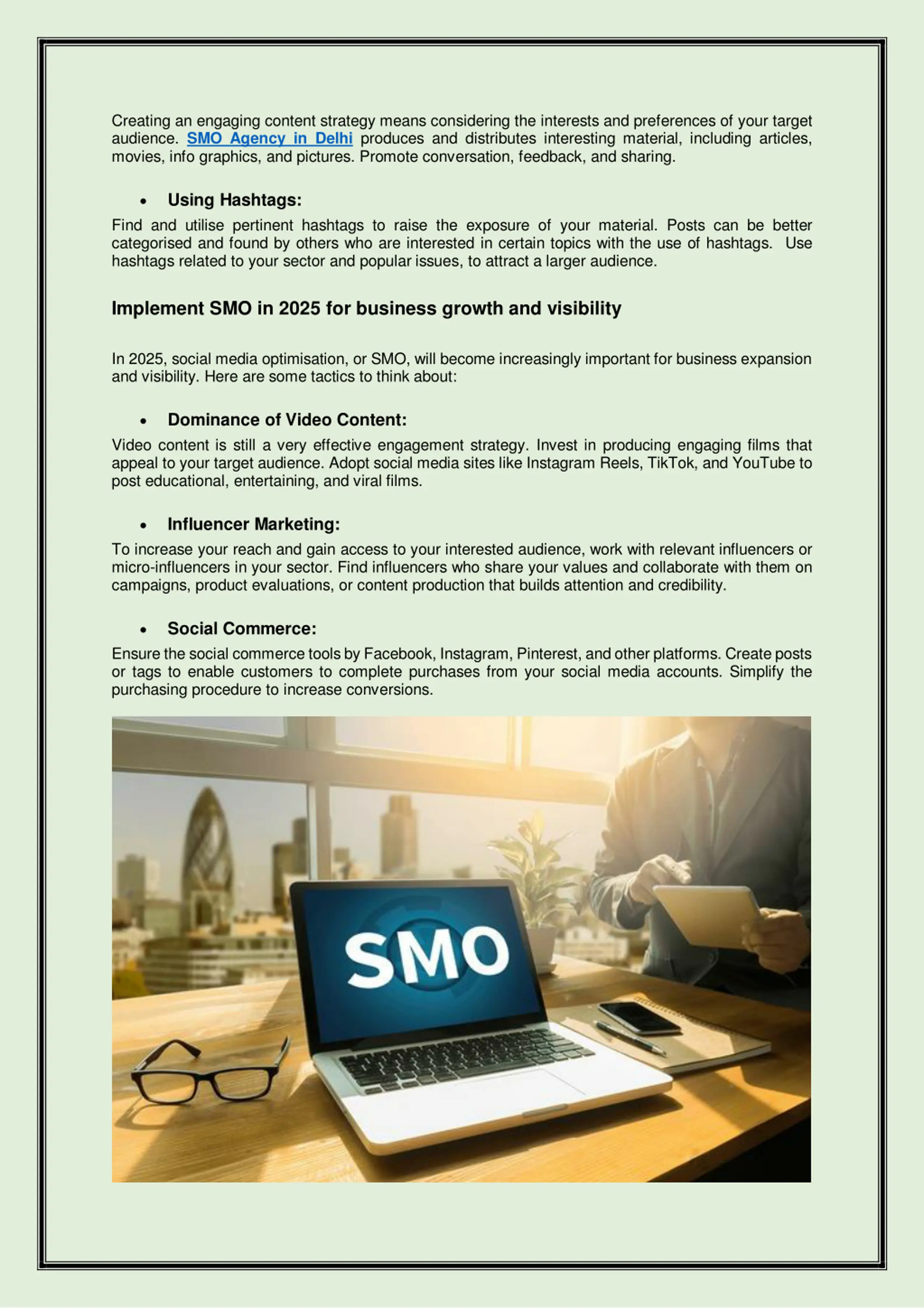 Creating an engaging content strategy means considering the interests and preferences of your target audience. SMO Agency in Delhi produces and distributes interesting material, including articles, movies, info graphics, and pictures. Promote conversation, feedback, and sharing. Using Hashtags: Find and utilise pertinent hashtags to raise the exposure of your material. Posts can be better categorised and found by others who are interested in certain topics with the use of hashtags. Use hashtags related to your sector and popular issues, to attract a larger audience. Implement SMO in 2025 for business growth and visibility In 2025, social media optimisation, or SMO, will become increasingly important for business expansion and visibility. Here are some tactics to think about: Dominance of Video Content: Video content is still a very effective engagement strategy. Invest in producing engaging films that appeal to your target audience. Adopt social media sites like Instagram Reels, TikTok, and YouTube to post educational, entertaining, and viral films. Influencer Marketing: To increase your reach and gain access to your interested audience, work with relevant influencers or micro-influencers in your sector. Find influencers who share your values and collaborate with them on campaigns, product evaluations, or content production that builds attention and credibility. Social Commerce: Ensure the social commerce tools by Facebook, Instagram, Pinterest, and other platforms. Create posts or tags to enable customers to complete purchases from your social media accounts. Simplify the purchasing procedure to increase conversions.