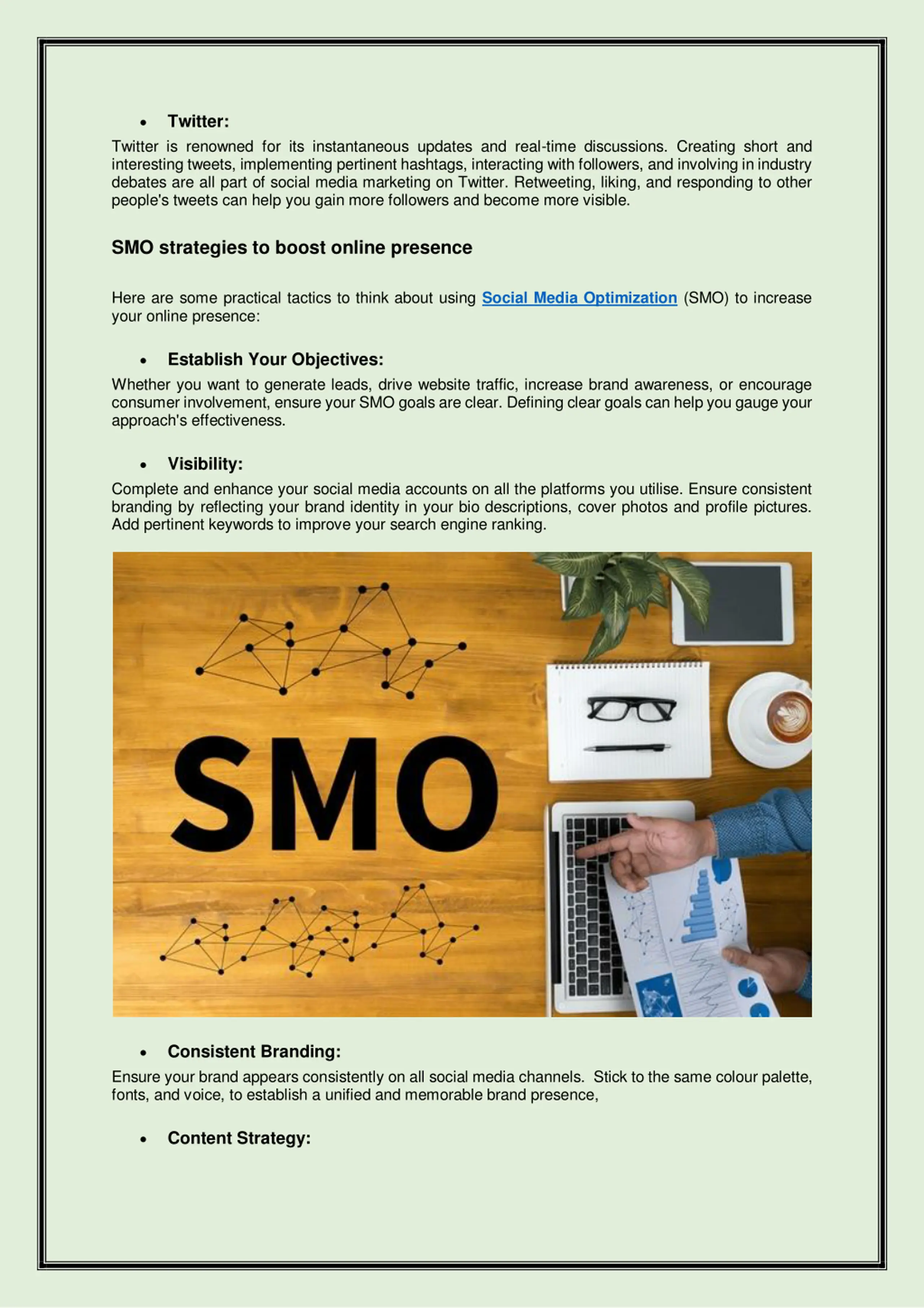 Twitter: Twitter is renowned for its instantaneous updates and real-time discussions. Creating short and interesting tweets, implementing pertinent hashtags, interacting with followers, and involving in industry debates are all part of social media marketing on Twitter. Retweeting, liking, and responding to other people's tweets can help you gain more followers and become more visible. SMO strategies to boost online presence Here are some practical tactics to think about using Social Media Optimization (SMO) to increase your online presence: Establish Your Objectives: Whether you want to generate leads, drive website traffic, increase brand awareness, or encourage consumer involvement, ensure your SMO goals are clear. Defining clear goals can help you gauge your approach's effectiveness. Visibility: Complete and enhance your social media accounts on all the platforms you utilise. Ensure consistent branding by reflecting your brand identity in your bio descriptions, cover photos and profile pictures. Add pertinent keywords to improve your search engine ranking. Consistent Branding: Ensure your brand appears consistently on all social media channels. Stick to the same colour palette, fonts, and voice, to establish a unified and memorable brand presence, Content Strategy: