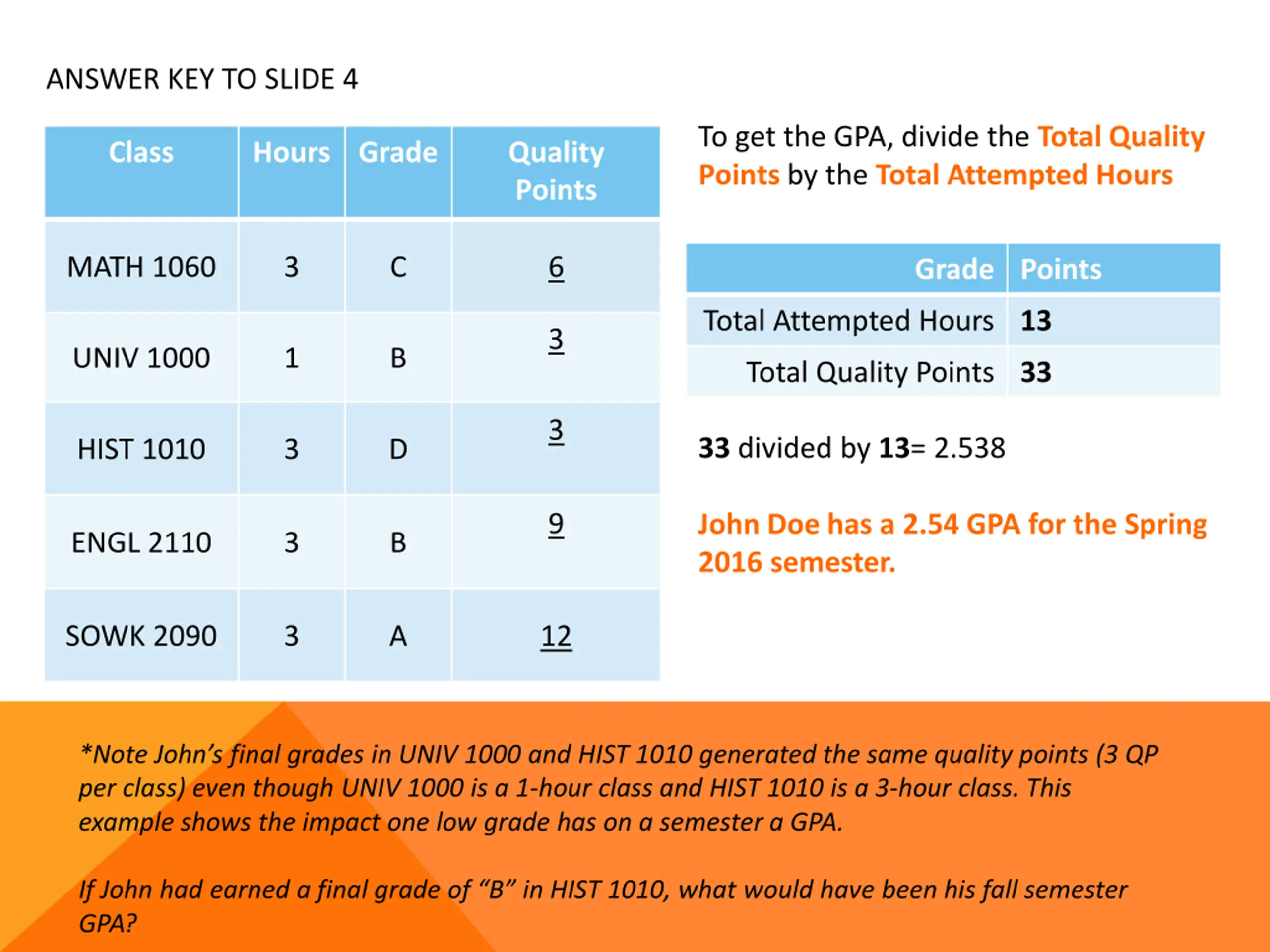 ANSWER KEY TO SLIDE 4 To get the GPA, divide the Total Quality Points by the Total Attempted Hours Class Hours Grade Quality Points MATH 1060 3 C 6 Grade Points Total Attempted Hours 13 3 UNIV 1000 1 B Total Quality Points 33 3 33 divided by 13= 2.538 HIST 1010 3 D 9 John Doe has a 2.54 GPA for the Spring 2016 semester. ENGL 2110 3 B SOWK 2090 3 A 12 *Note John s final grades in UNIV 1000 and HIST 1010 generated the same quality points (3 QP per class) even though UNIV 1000 is a 1-hour class and HIST 1010 is a 3-hour class. This example shows the impact one low grade has on a semester a GPA. If John had earned a final grade of B in HIST 1010, what would have been his fall semester GPA?