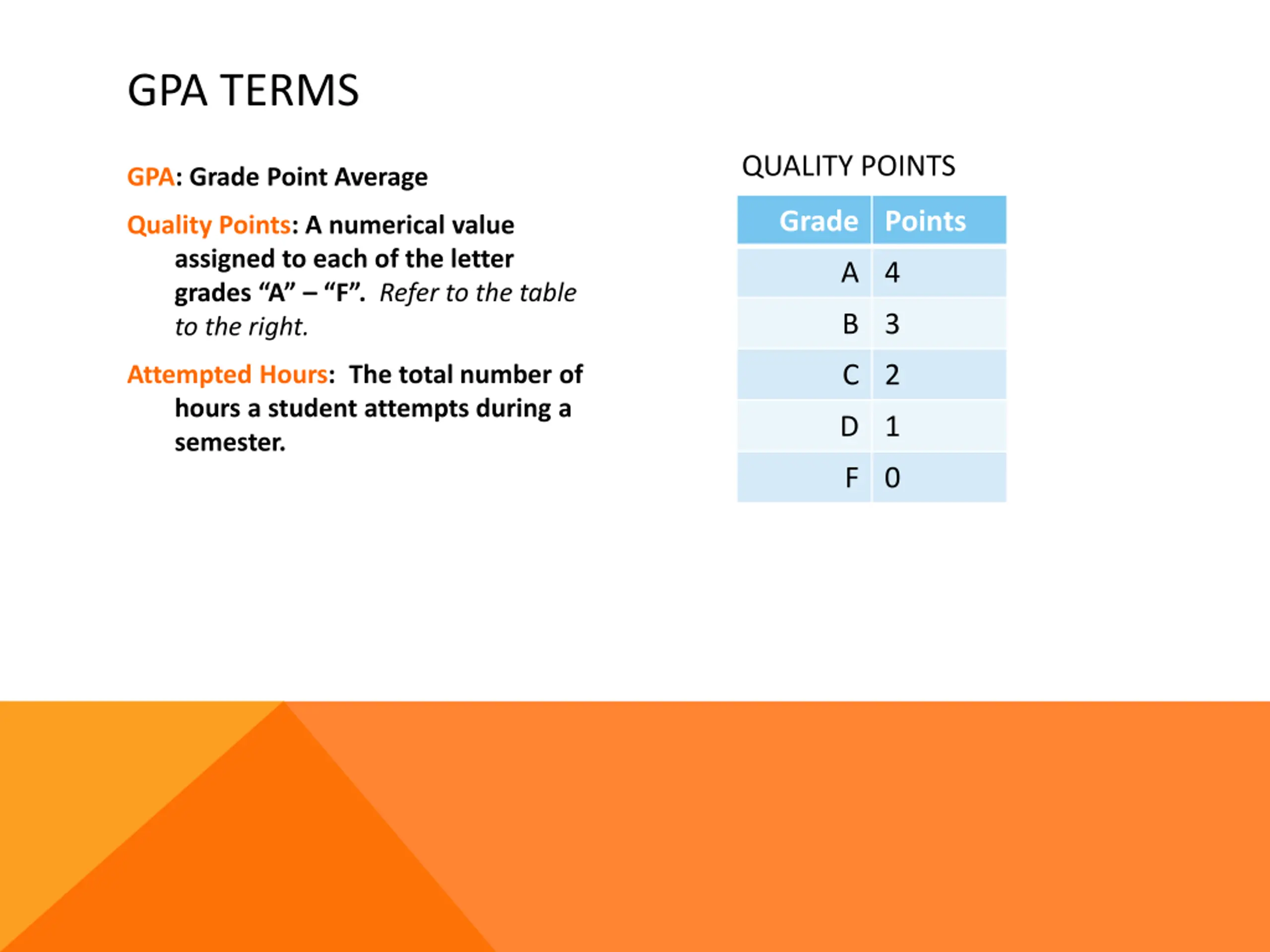 GPA TERMS QUALITY POINTS GPA: Grade Point Average Grade Points Quality Points: A numerical value assigned to each of the letter grades A F . Refer to the table to the right. A 4 B 3 C 2 Attempted Hours: The total number of hours a student attempts during a semester. D 1 F 0