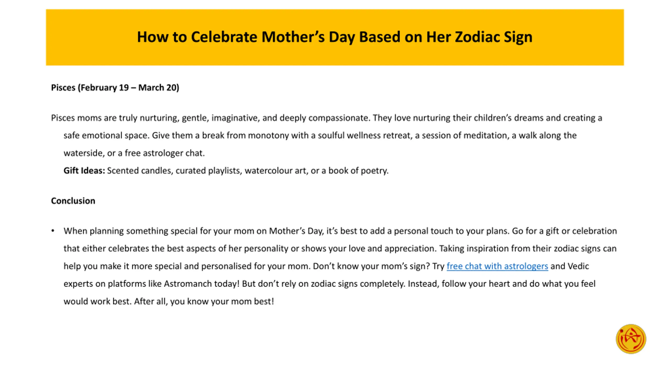 How to Celebrate Mothers Day Based on Her Zodiac Sign Pisces (February 19 March 20) Pisces moms are truly nurturing, gentle, imaginative, and deeply compassionate. They love nurturing their children s dreams and creating a safe emotional space. Give them a break from monotony with a soulful wellness retreat, a session of meditation, a walk along the waterside, or a free astrologer chat. Gift Ideas: Scented candles, curated playlists, watercolour art, or a book of poetry. Conclusion When planning something special for your mom on Mother s Day, it s best to add a personal touch to your plans. Go for a gift or celebration that either celebrates the best aspects of her personality or shows your love and appreciation. Taking inspiration from their zodiac signs can help you make it more special and personalised for your mom. Don t know your mom s sign? Try free chat with astrologers and Vedic experts on platforms like Astromanch today! But don t rely on zodiac signs completely. Instead, follow your heart and do what you feel would work best. After all, you know your mom best!