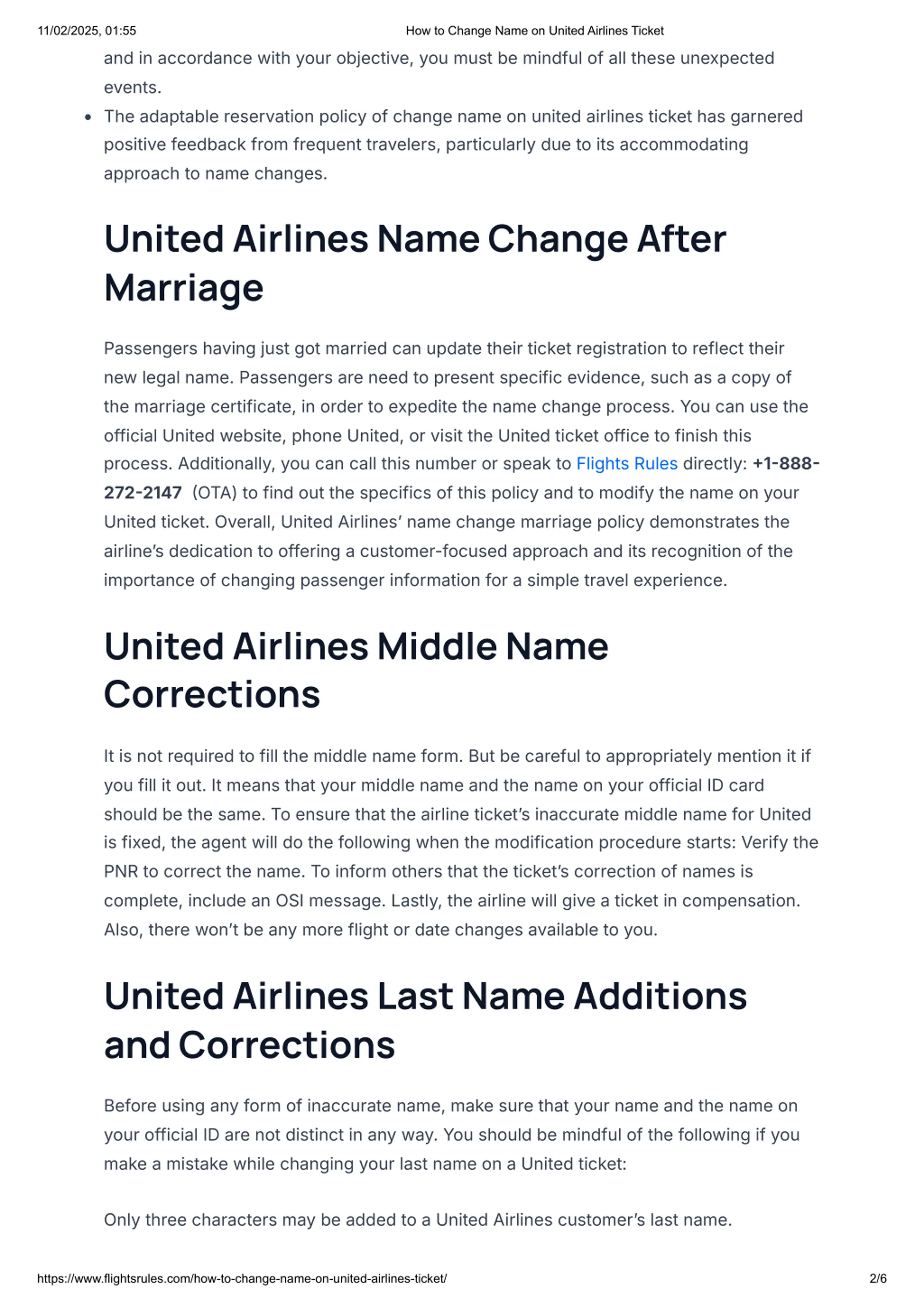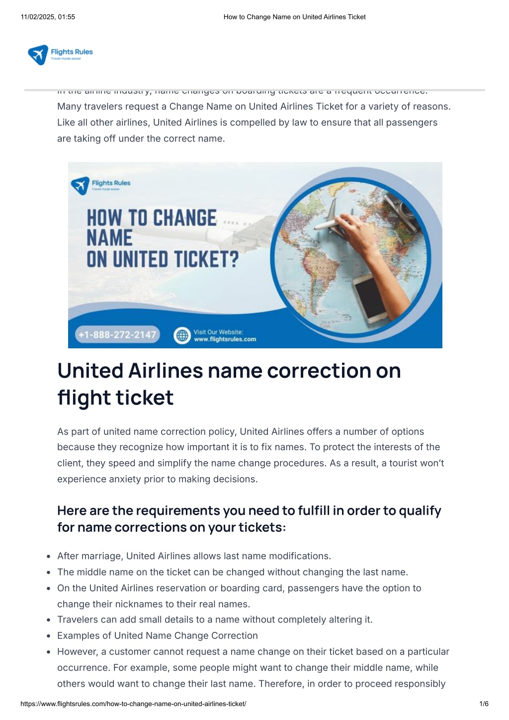 11/02/2025, 01:55 How to Change Name on United Airlines Ticket andinaccordancewithyourobjective, youmustbemindfulofalltheseunexpected events. Theadaptablereservationpolicyofchangenameonunitedairlinestickethasgarnered positivefeedbackfromfrequenttravelers, particularlyduetoitsaccommodating approachtonamechanges. United Airlines Name Change After Marriage Passengershavingjustgotmarriedcanupdatetheirticketregistrationtoreflecttheir newlegalname. Passengersareneedtopresentspecificevidence, suchasacopyof themarriagecertificate, inordertoexpeditethenamechangeprocess. Youcanusethe officialUnitedwebsite, phoneUnited, orvisittheUnitedticketofficetofinishthis process. Additionally, youcancallthisnumberorspeaktoFlightsRulesdirectly: +1-888- 272-2147 ?OTA) tofindoutthespecificsofthispolicyandtomodifythenameonyour Unitedticket. Overall, UnitedAirlines namechangemarriagepolicydemonstratesthe airline sdedicationtoofferingacustomer-focusedapproachanditsrecognitionofthe importanceofchangingpassengerinformationforasimpletravelexperience. United Airlines Middle Name Corrections Itisnotrequiredtofillthemiddlenameform. Butbecarefultoappropriatelymentionitif youfillitout. ItmeansthatyourmiddlenameandthenameonyourofficialIDcard shouldbethesame. Toensurethattheairlineticket sinaccuratemiddlenameforUnited isfixed, theagentwilldothefollowingwhenthemodificationprocedurestarts: Verifythe PNRtocorrectthename. Toinformothersthattheticket scorrectionofnamesis complete, includeanOSImessage. Lastly, theairlinewillgiveaticketincompensation. Also, therewon tbeanymoreflightordatechangesavailabletoyou. United Airlines Last Name Additions and Corrections Beforeusinganyformofinaccuratename, makesurethatyournameandthenameon yourofficialIDarenotdistinctinanyway. Youshouldbemindfulofthefollowingifyou makeamistakewhilechangingyourlastnameonaUnitedticket: OnlythreecharactersmaybeaddedtoaUnitedAirlinescustomer slastname. https://www.flightsrules.com/how-to-change-name-on-united-airlines-ticket/ 2/6