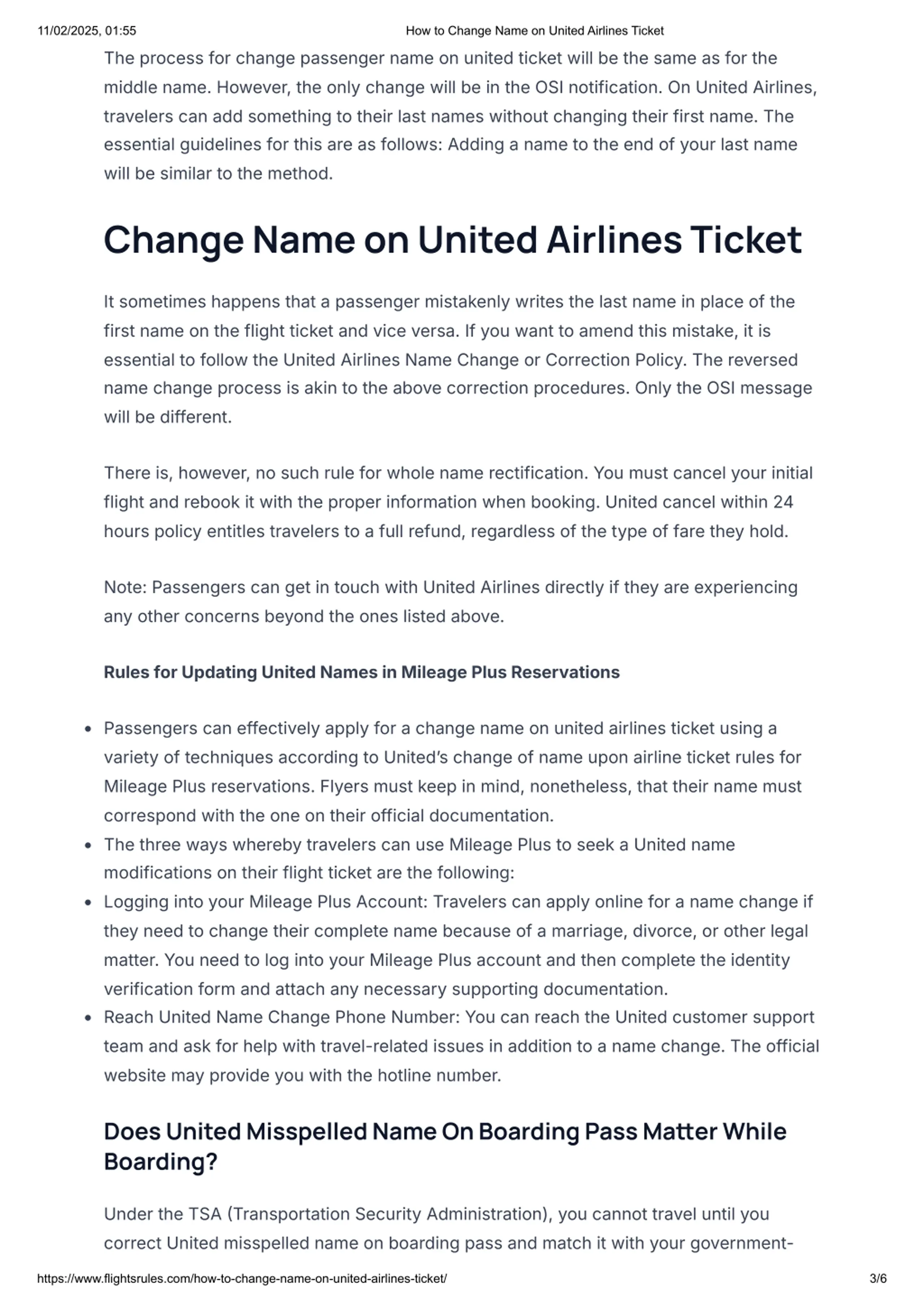 11/02/2025, 01:55 How to Change Name on United Airlines Ticket Theprocessforchangepassengernameonunitedticketwillbethesameasforthe middlename. However, theonlychangewillbeintheOSInotification. OnUnitedAirlines, travelerscanaddsomethingtotheirlastnameswithoutchangingtheirfirstname. The essentialguidelinesforthisareasfollows: Addinganametotheendofyourlastname willbesimilartothemethod. Change Name on United Airlines Ticket Itsometimeshappensthatapassengermistakenlywritesthelastnameinplaceofthe firstnameontheflightticketandviceversa. Ifyouwanttoamendthismistake, itis essentialtofollowtheUnitedAirlinesNameChangeorCorrectionPolicy. Thereversed namechangeprocessisakintotheabovecorrectionprocedures. OnlytheOSImessage willbedifferent. Thereis, however, nosuchruleforwholenamerectification. Youmustcancelyourinitial flightandrebookitwiththeproperinformationwhenbooking. Unitedcancelwithin 24 hourspolicyentitlestravelerstoafullrefund, regardlessofthetypeoffaretheyhold. Note: PassengerscangetintouchwithUnitedAirlinesdirectlyiftheyareexperiencing anyotherconcernsbeyondtheoneslistedabove. RulesforUpdatingUnitedNamesinMileagePlusReservations Passengerscaneffectivelyapplyforachangenameonunitedairlinesticketusinga varietyoftechniquesaccordingtoUnited schangeofnameuponairlineticketrulesfor MileagePlusreservations. Flyersmustkeepinmind, nonetheless, thattheirnamemust correspondwiththeoneontheirofficialdocumentation. ThethreewayswherebytravelerscanuseMileagePlustoseekaUnitedname modificationsontheirflightticketarethefollowing: LoggingintoyourMileagePlusAccount: Travelerscanapplyonlineforanamechangeif theyneedtochangetheircompletenamebecauseofamarriage, divorce, orotherlegal matter. YouneedtologintoyourMileagePlusaccountandthencompletetheidentity verificationformandattachanynecessarysupportingdocumentation. ReachUnitedNameChangePhoneNumber: YoucanreachtheUnitedcustomersupport teamandaskforhelpwithtravel-relatedissuesinadditiontoanamechange. Theofficial websitemayprovideyouwiththehotlinenumber. Does United Misspelled Name On Boarding Pass Ma?er While Boarding? UndertheTSA ?TransportationSecurityAdministration), youcannottraveluntilyou correctUnitedmisspellednameonboardingpassandmatchitwithyourgovernment- https://www.flightsrules.com/how-to-change-name-on-united-airlines-ticket/ 3/6