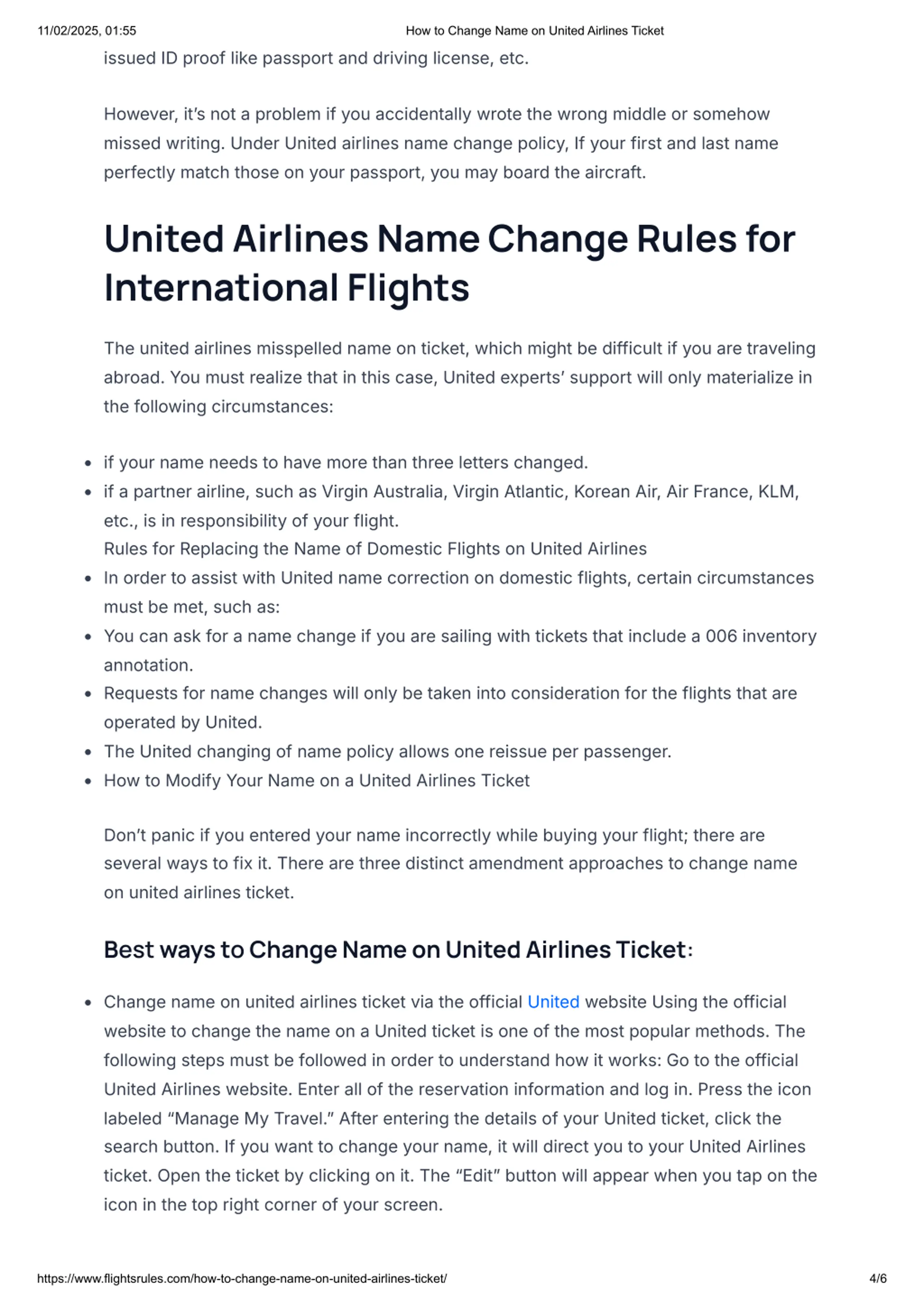 11/02/2025, 01:55 How to Change Name on United Airlines Ticket issuedIDprooflikepassportanddrivinglicense, etc. However, it snotaproblemifyouaccidentallywrotethewrongmiddleorsomehow missedwriting. UnderUnitedairlinesnamechangepolicy, Ifyourfirstandlastname perfectlymatchthoseonyourpassport, youmayboardtheaircraft. United Airlines Name Change Rules for International Flights Theunitedairlinesmisspellednameonticket, whichmightbedifficultifyouaretraveling abroad. Youmustrealizethatinthiscase, Unitedexperts supportwillonlymaterializein thefollowingcircumstances: ifyournameneedstohavemorethanthreeletterschanged. ifapartnerairline, suchasVirginAustralia, VirginAtlantic, KoreanAir, AirFrance, KLM, etc., isinresponsibilityofyourflight. RulesforReplacingtheNameofDomesticFlightsonUnitedAirlines InordertoassistwithUnitednamecorrectionondomesticflights, certaincircumstances mustbemet, suchas: Youcanaskforanamechangeifyouaresailingwithticketsthatincludea 006 inventory annotation. Requestsfornamechangeswillonlybetakenintoconsiderationfortheflightsthatare operatedbyUnited. TheUnitedchangingofnamepolicyallowsonereissueperpassenger. HowtoModifyYourNameonaUnitedAirlinesTicket Don tpanicifyouenteredyournameincorrectlywhilebuyingyourflight; thereare severalwaystofixit. Therearethreedistinctamendmentapproachestochangename onunitedairlinesticket. Best ways to Change Name on United Airlines Ticket: ChangenameonunitedairlinesticketviatheofficialUnitedwebsiteUsingtheofficial websitetochangethenameonaUnitedticketisoneofthemostpopularmethods. The followingstepsmustbefollowedinordertounderstandhowitworks: Gototheofficial UnitedAirlineswebsite. Enterallofthereservationinformationandlogin. Presstheicon labeled ManageMyTravel. AfterenteringthedetailsofyourUnitedticket, clickthe searchbutton. Ifyouwanttochangeyourname, itwilldirectyoutoyourUnitedAirlines ticket. Opentheticketbyclickingonit. The Edit buttonwillappearwhenyoutaponthe iconinthetoprightcornerofyourscreen. https://www.flightsrules.com/how-to-change-name-on-united-airlines-ticket/ 4/6